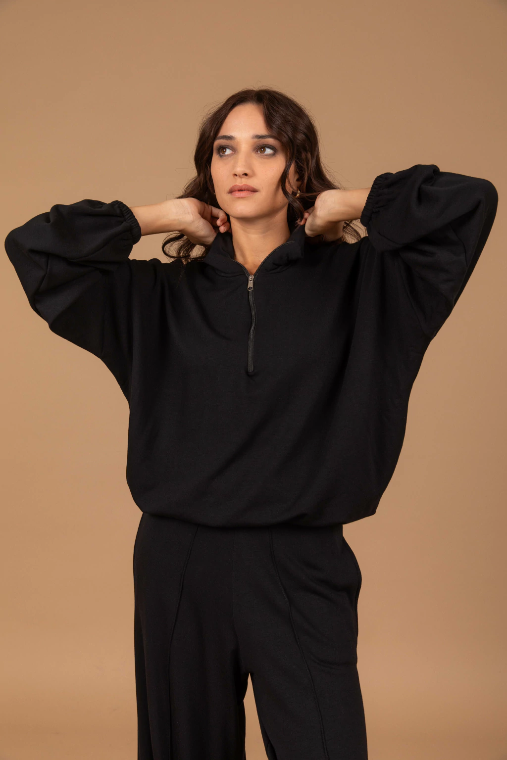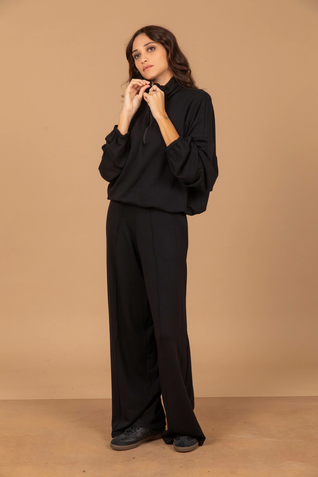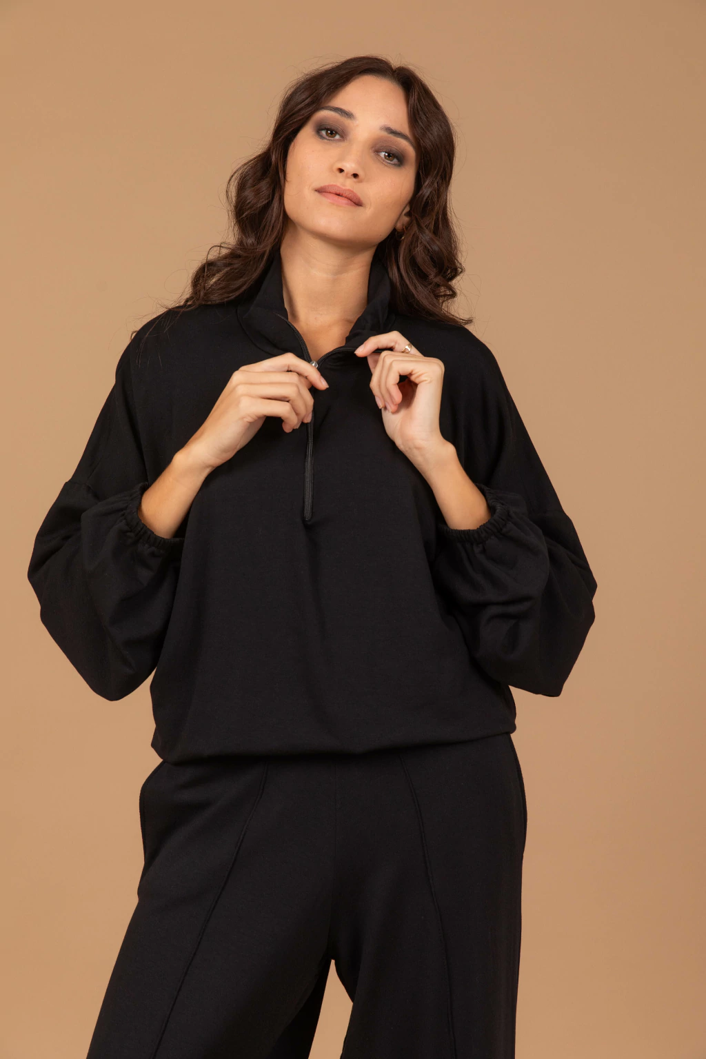 El buzo Bosco tiene un cierre en el cuello, la tela rústica con friza tiene caída y proporciona una sensación de confort absoluto. Además, tiene un elástico que permite ajustarlo a la cintura o lucirlo suelto. ¡Perfecto para un look relajado y chic!