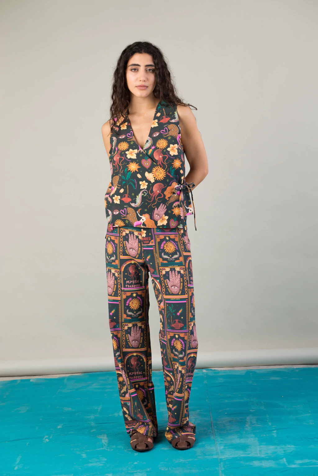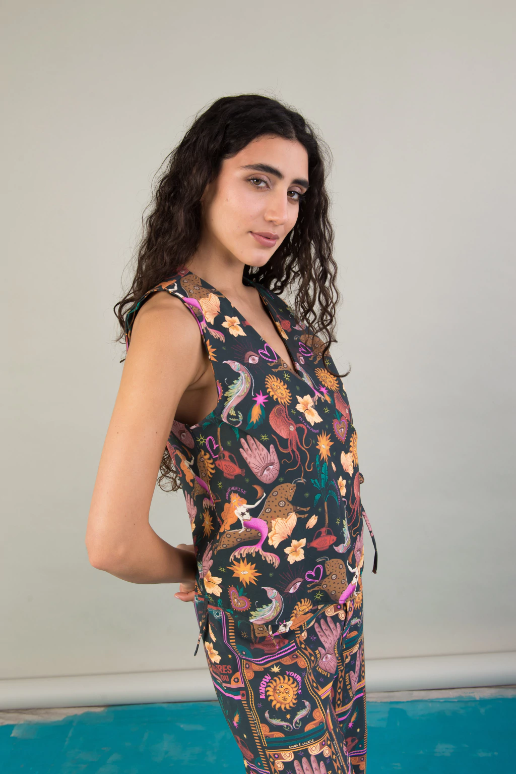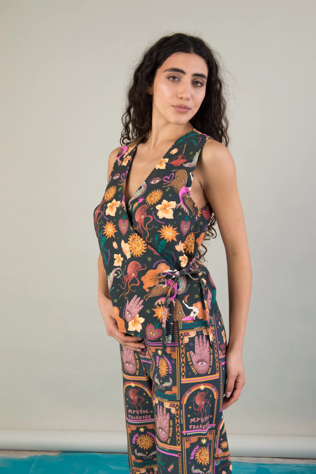 Chaleco Mystic negro, una prenda versátil que podés usar también como blusa. Su diseño con tiritas regulables te permite ajustarlo a tu gusto, brindando comodidad y estilo. Confeccionado en tela twill con peso, fresca y atemporal, su textura única no brilla, ideal para cualquier momento del día o la noche. Además, cuenta con una estampa exclusiva de AnnaCherise que lo hace único y especial. La podes usar en Set con el Pantalon Mistyc Negro queda increible.