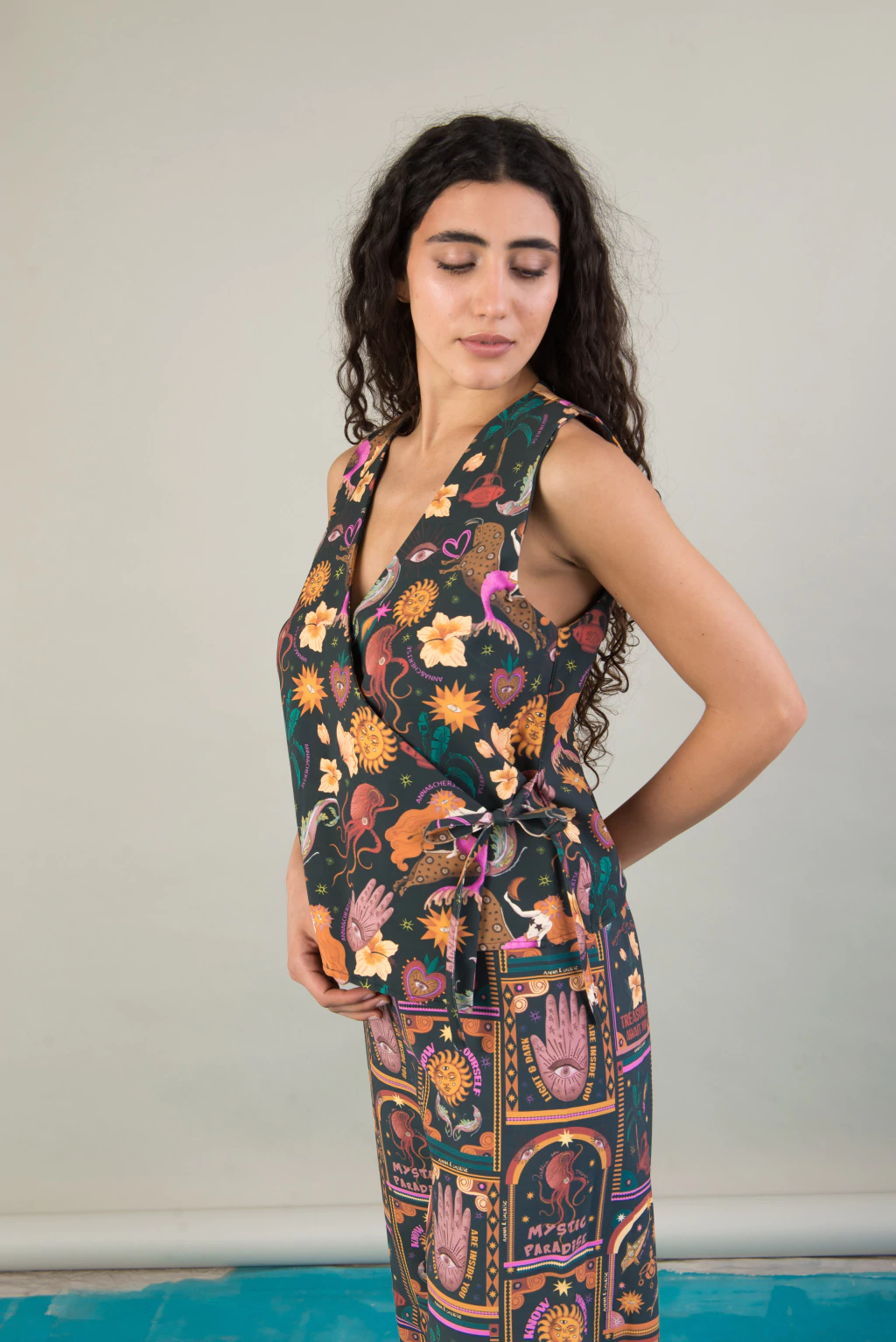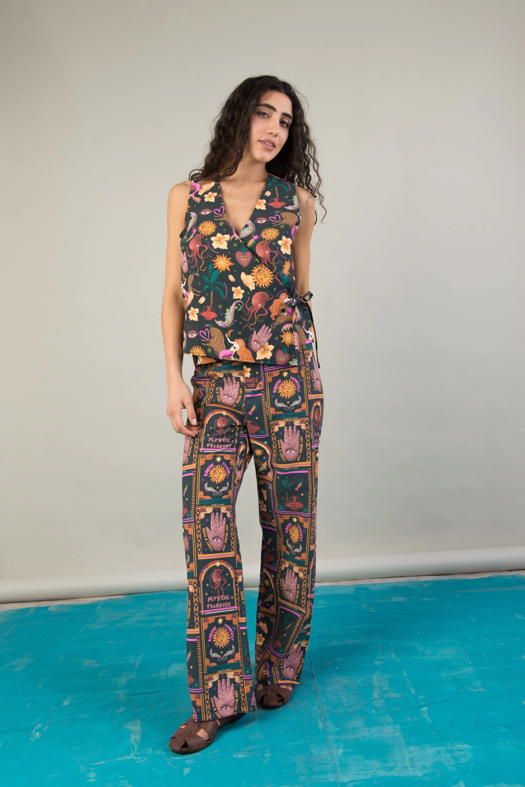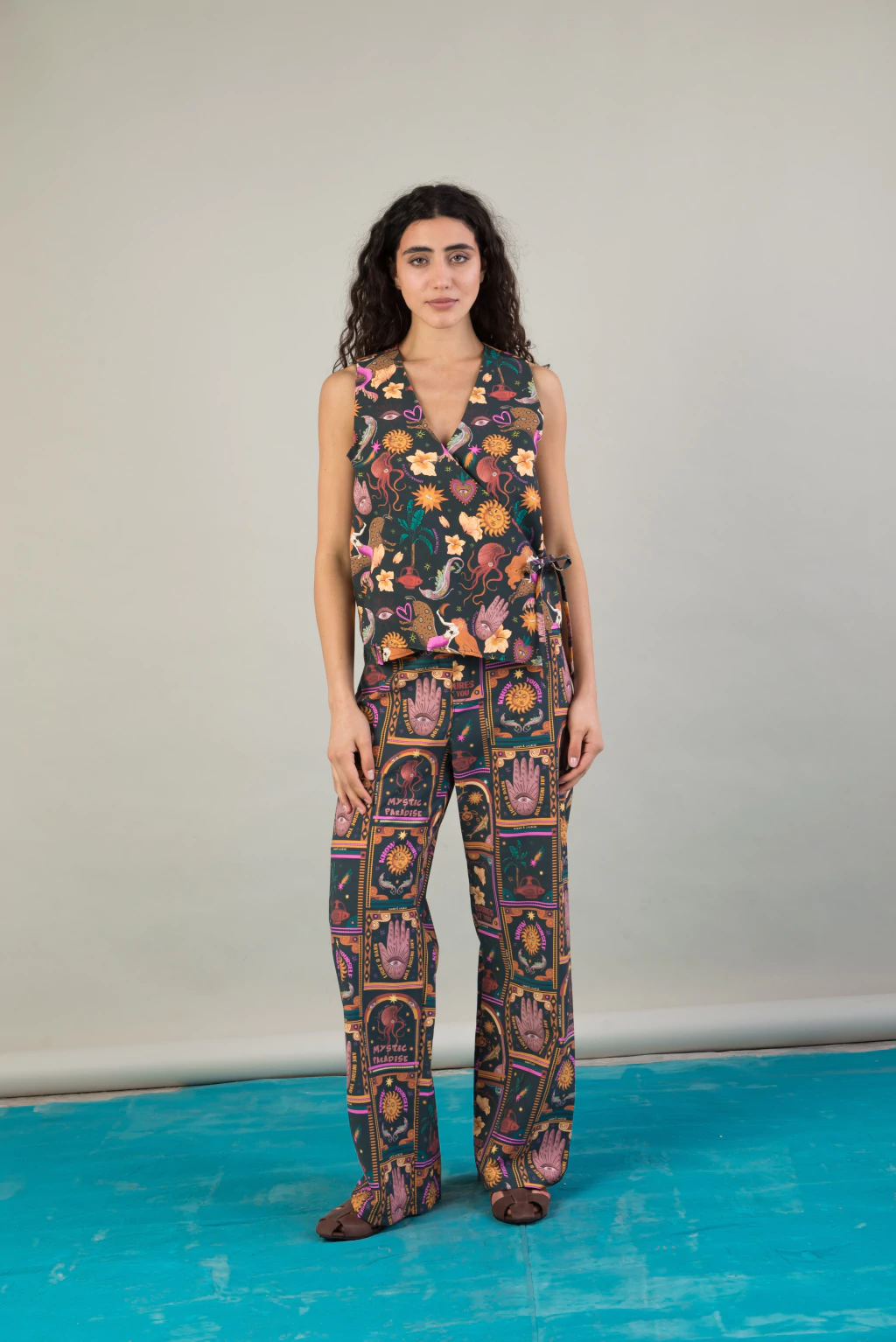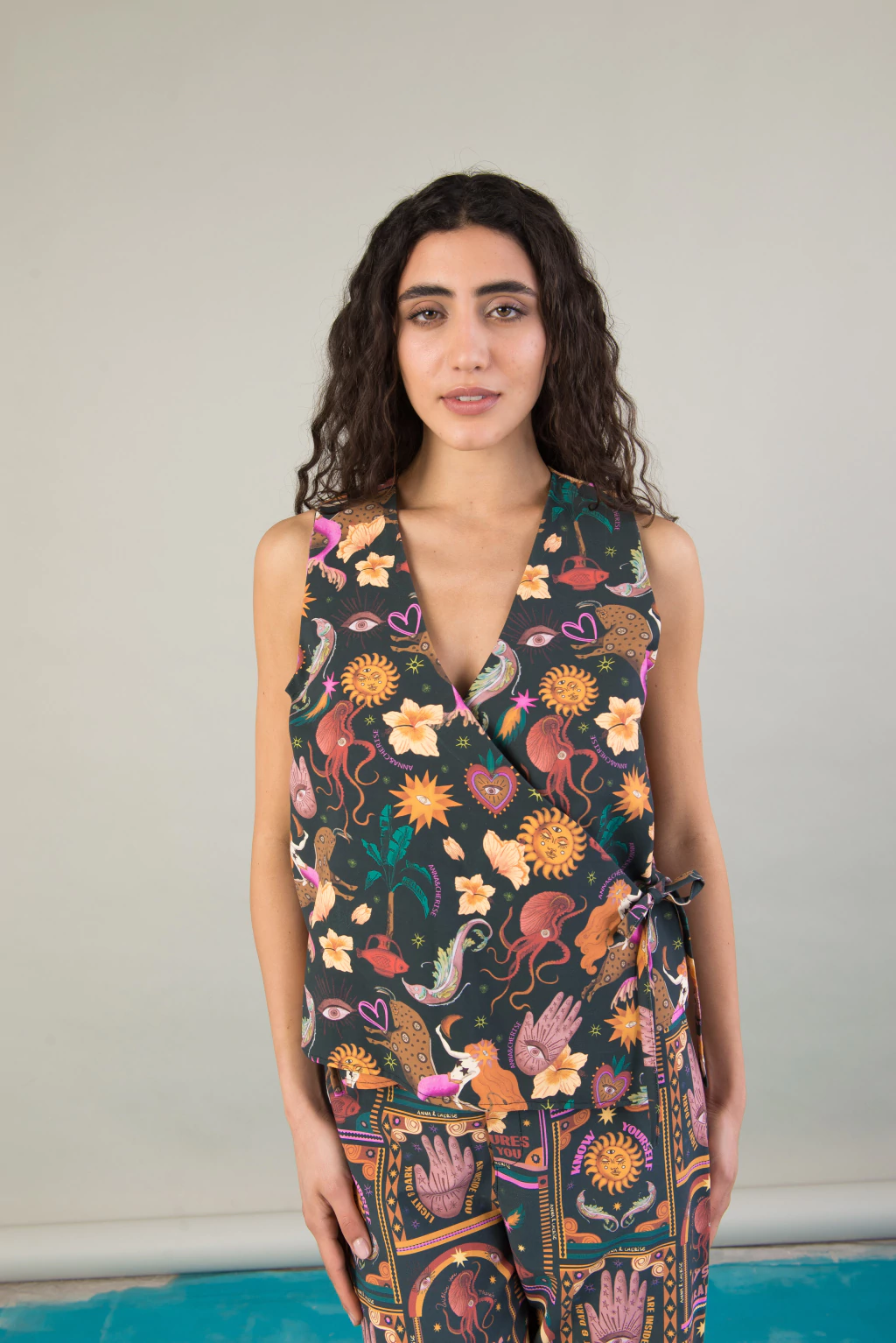Chaleco Mystic negro, una prenda versátil que podés usar también como blusa. Su diseño con tiritas regulables te permite ajustarlo a tu gusto, brindando comodidad y estilo. Confeccionado en tela twill con peso, fresca y atemporal, su textura única no brilla, ideal para cualquier momento del día o la noche. Además, cuenta con una estampa exclusiva de AnnaCherise que lo hace único y especial. La podes usar en Set con el Pantalon Mistyc Negro queda increible.