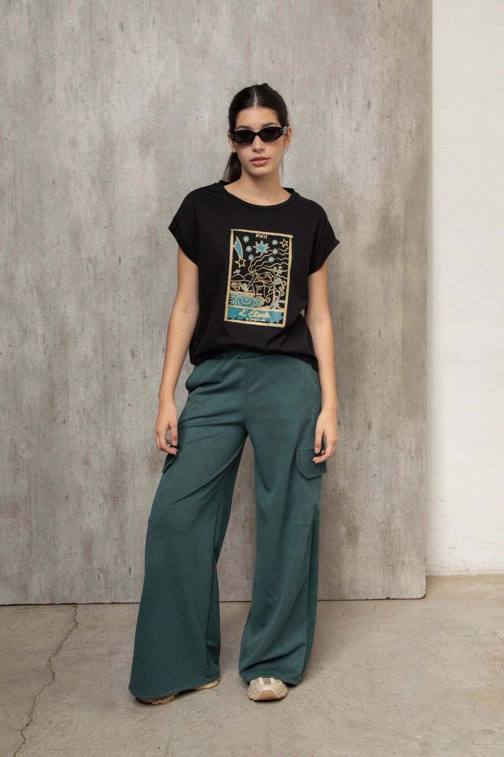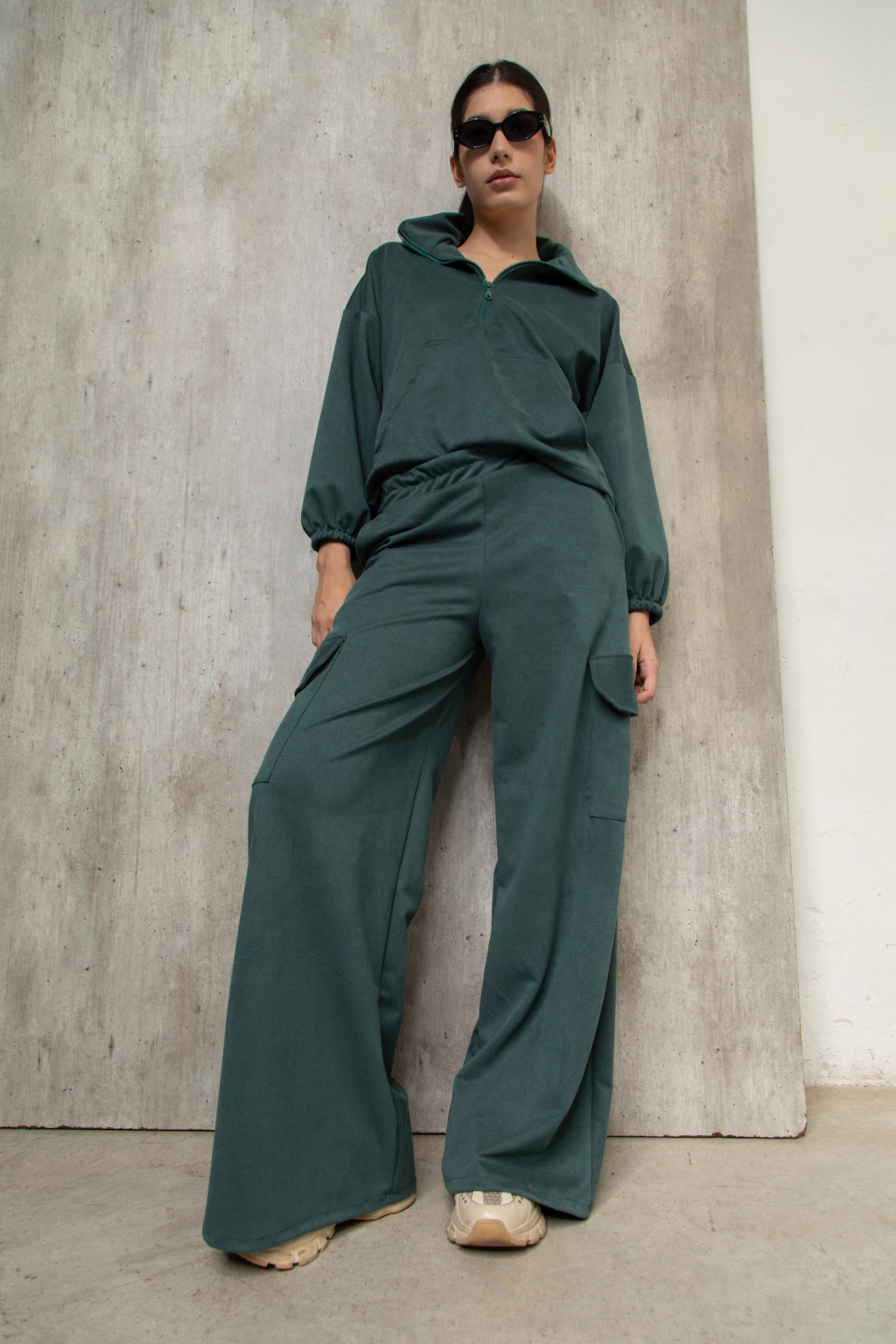 Pantalón amplio confeccionado con sastrero queen color verde. Su textura es medio gamuzada y tiene un leve brillo. Tiene mucha caída y es calentita. Nos encanta el pantalón Tipa por su versatilidad y comodidad, lo podes usar con el buzo Tipa o con cualquier otra prenda para un look de día o de noche. Tiene bolsillos cuadrados delanteros y bolsillos a los costados tipo cargo.