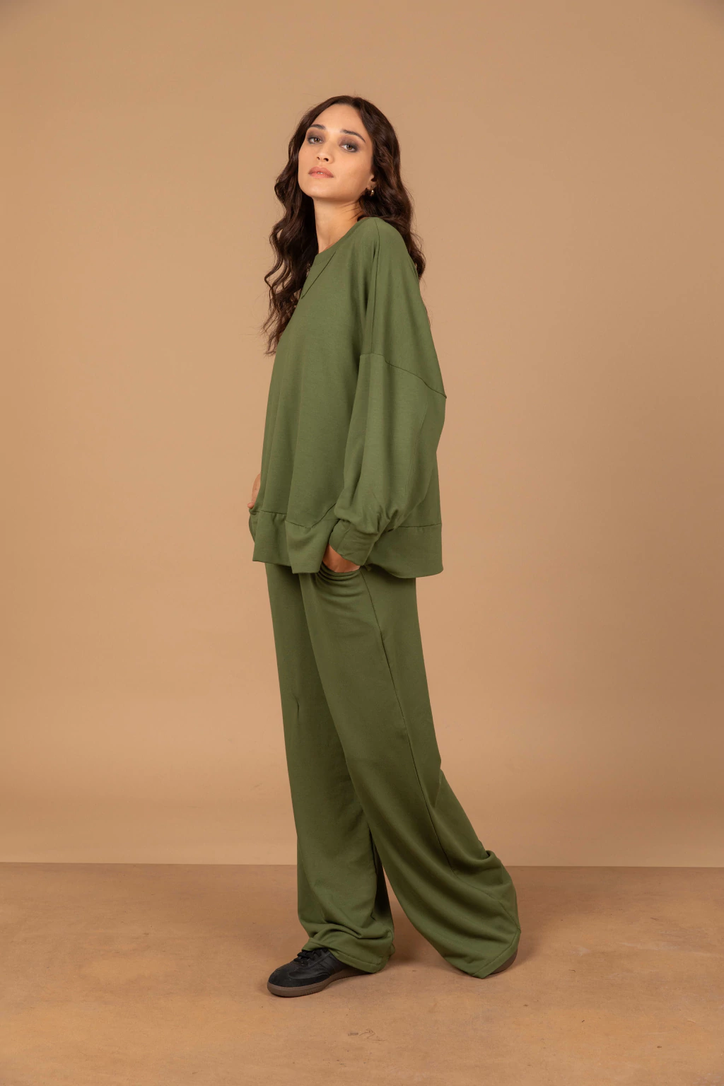 Este hermoso Set de buzo y pantalón verde matcha está diseñado para brindarte comodidad y estilo. La tela rústica frizada te abraza suavemente, mientras que el pantalón tiene bolsillos laterales que se adaptan a tu figura. El buzo cuenta con un elegante diseño de recortes que asegura un calce más cómodo, manga dolman holgada y ancha en los hombros, se estrecha hacia la muñeca. Calentito, liviano ideal para esos días frescos.Es un Buzo amplio, talle Unico.