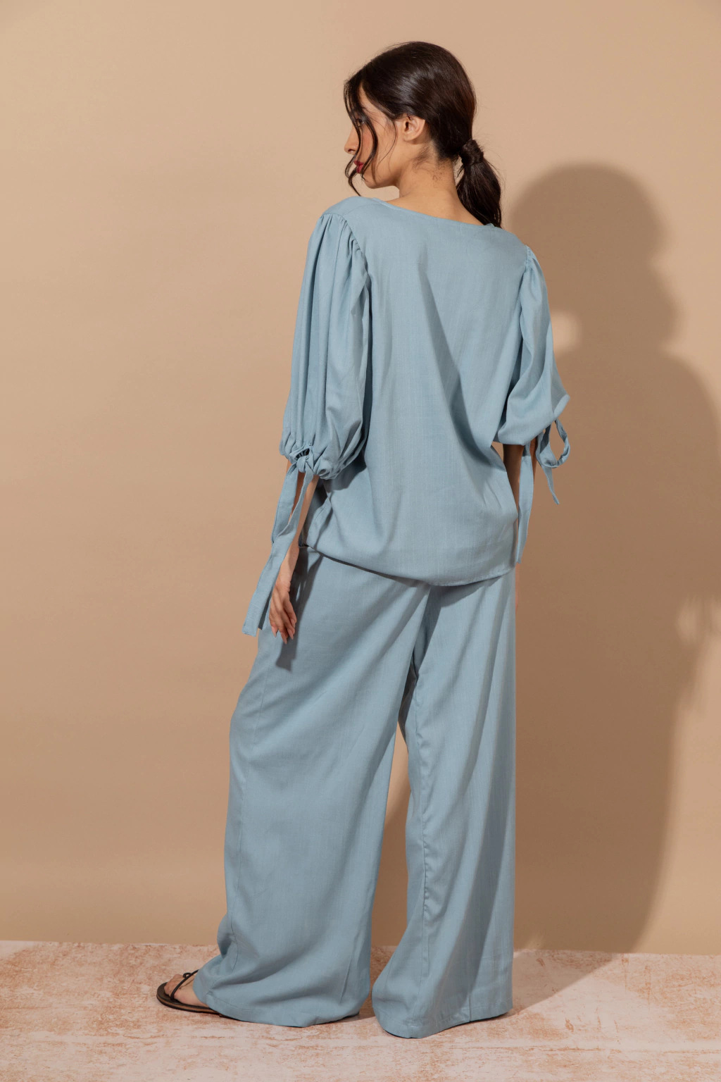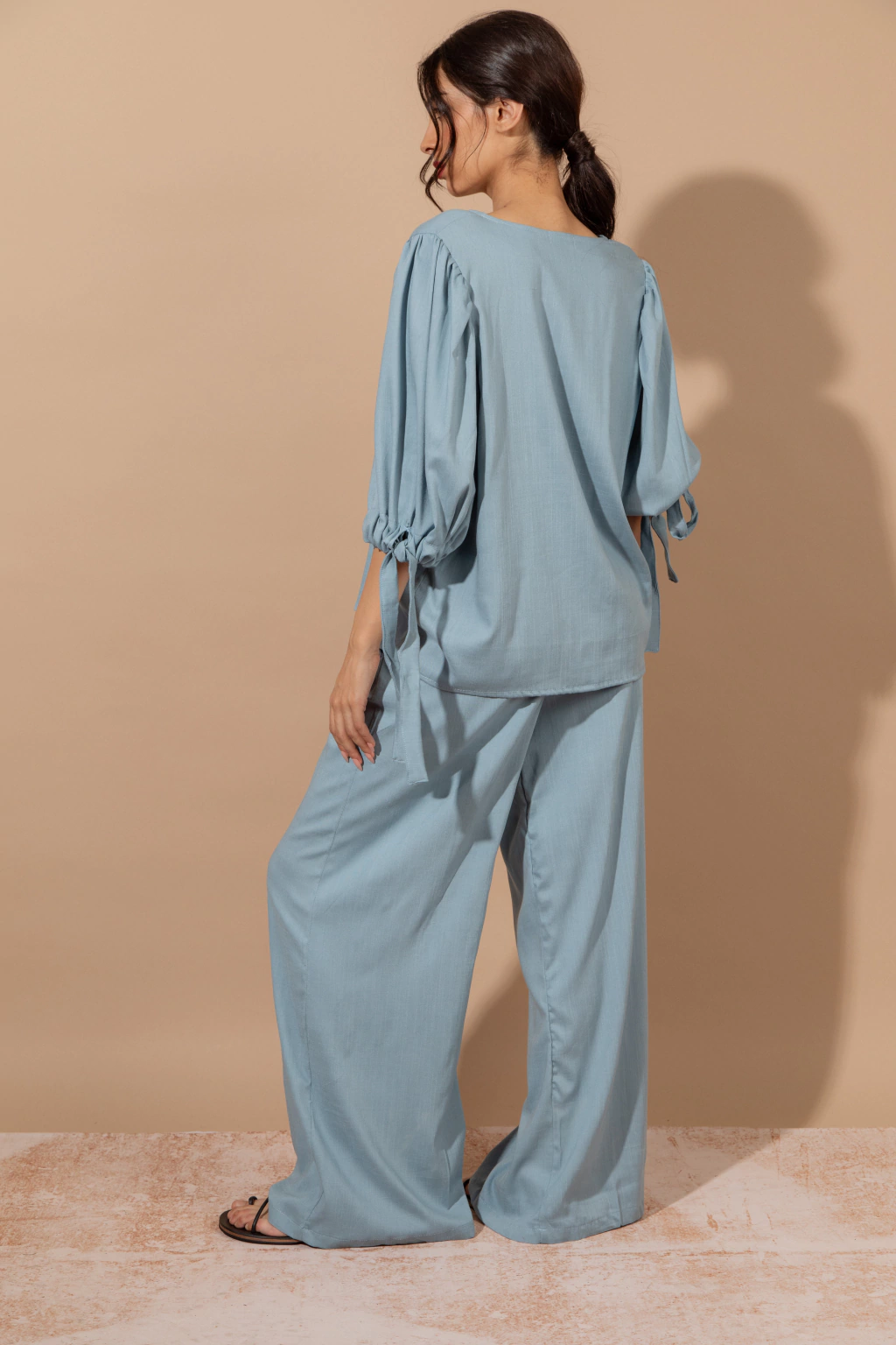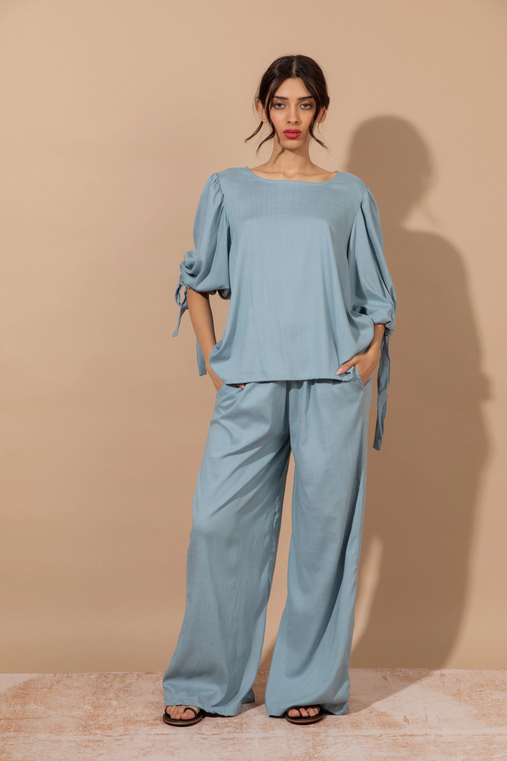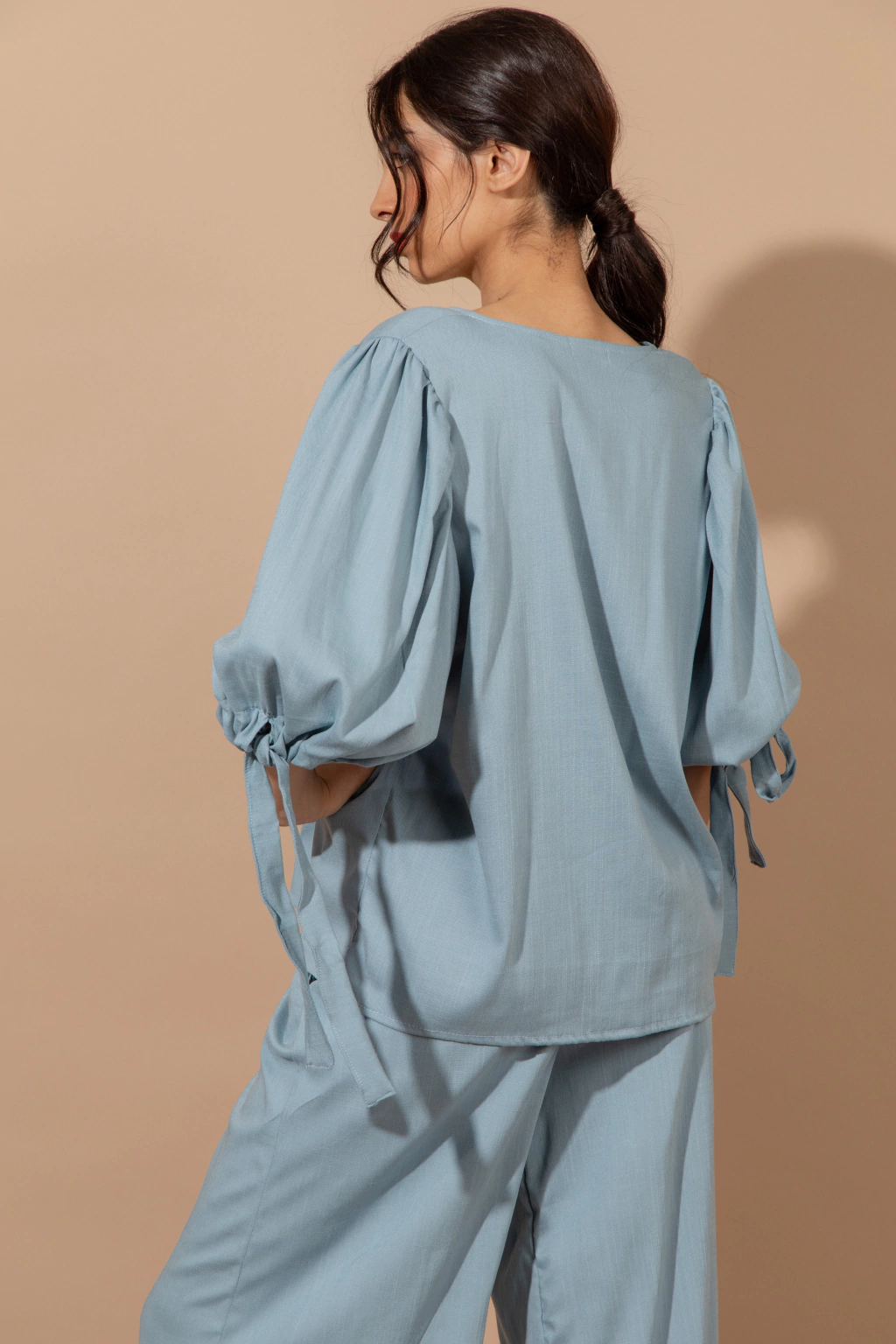 Blusa Bahia Celeste: Blusa de lino elastizado color celeste, con mangas amplias con lazo en el piño. Podes combinarlo con el pantalon wide leg Bahia o usarla con cualquier otra prenda ya que aporta comodidad,frecura y estilo.