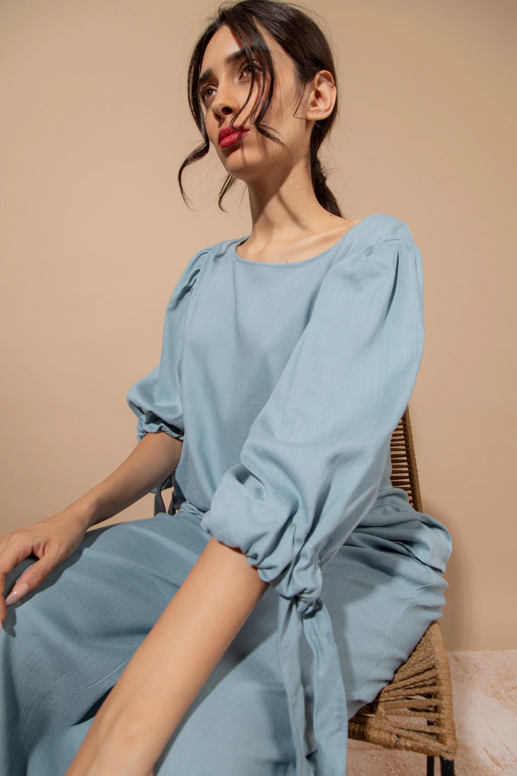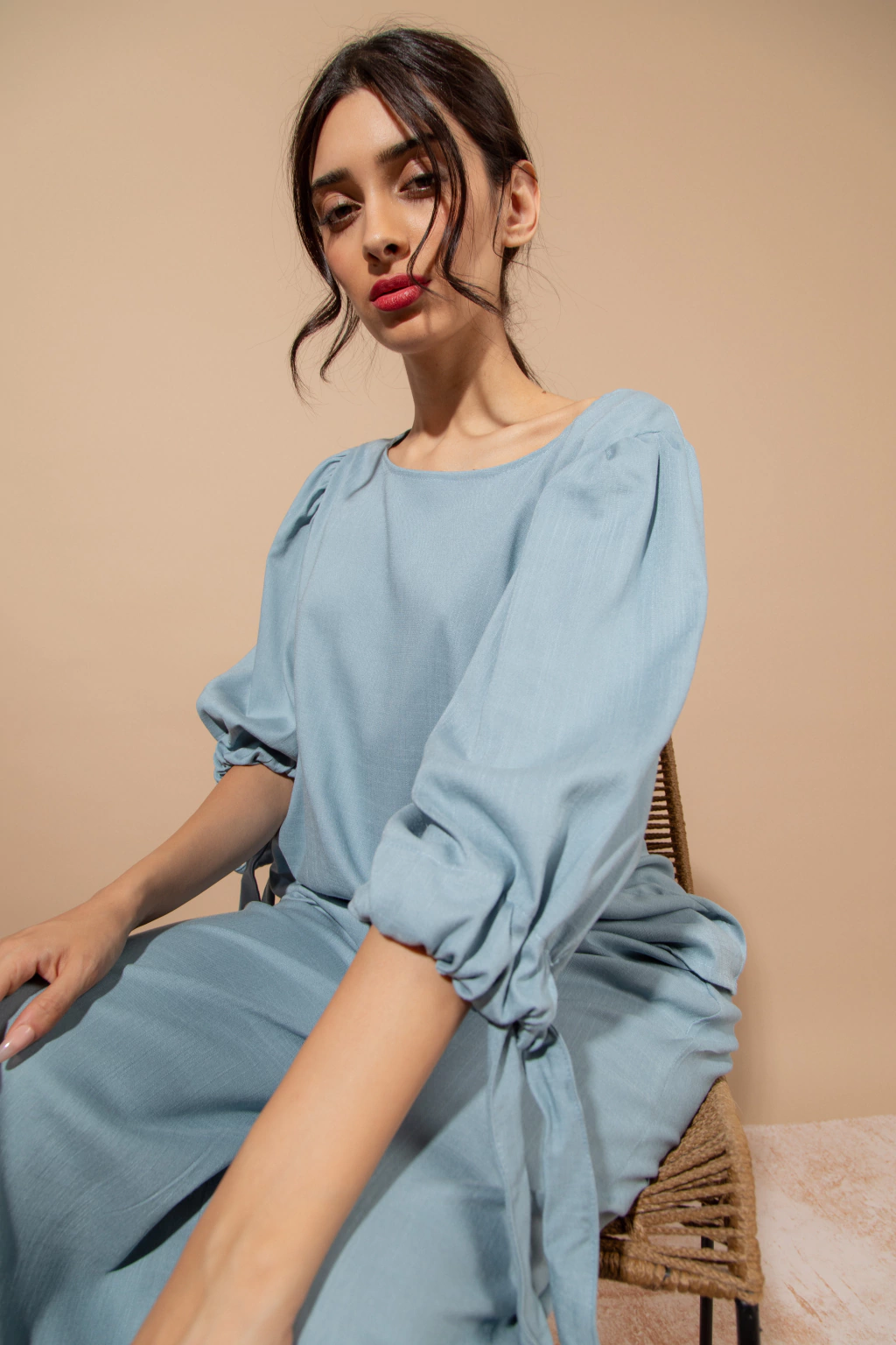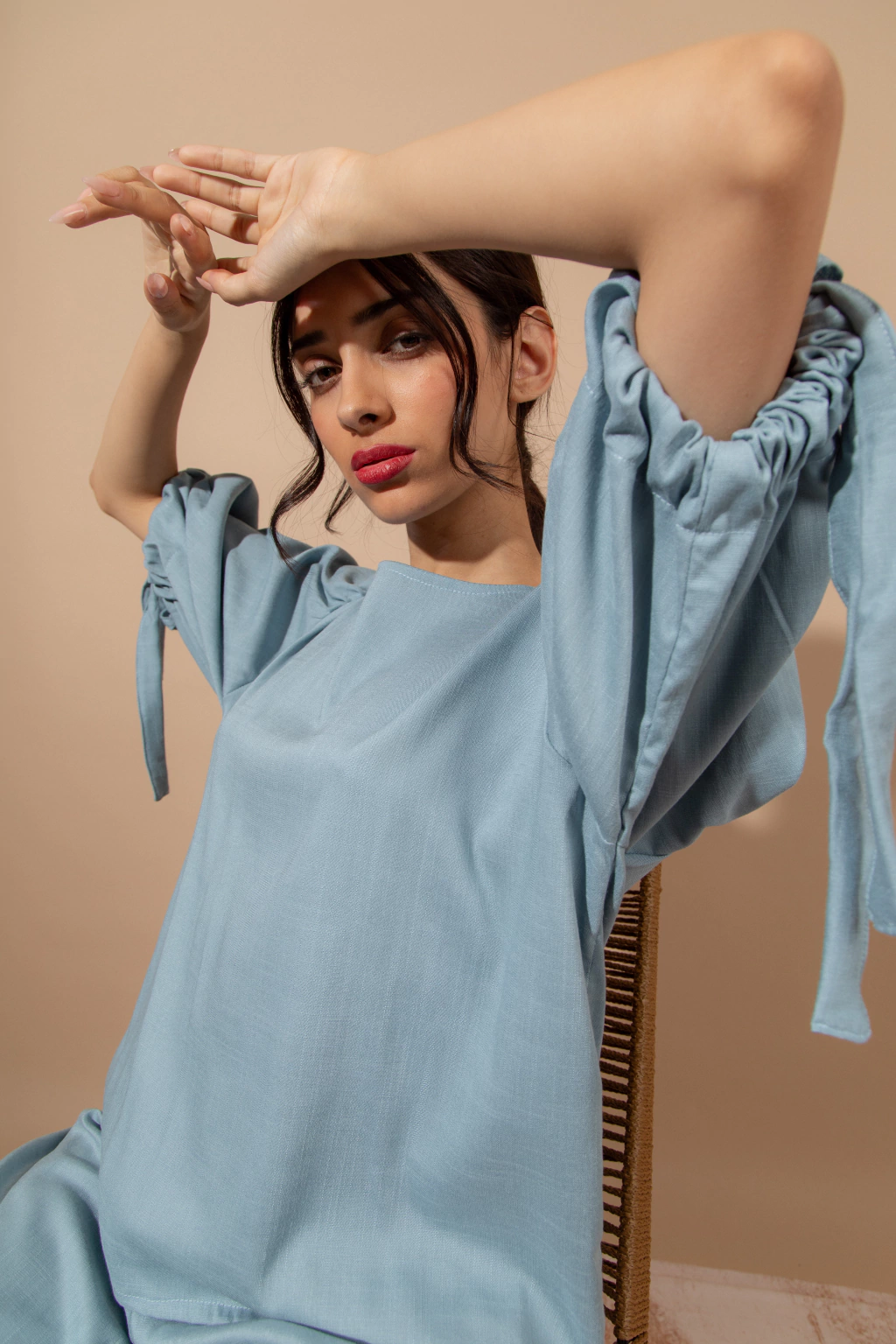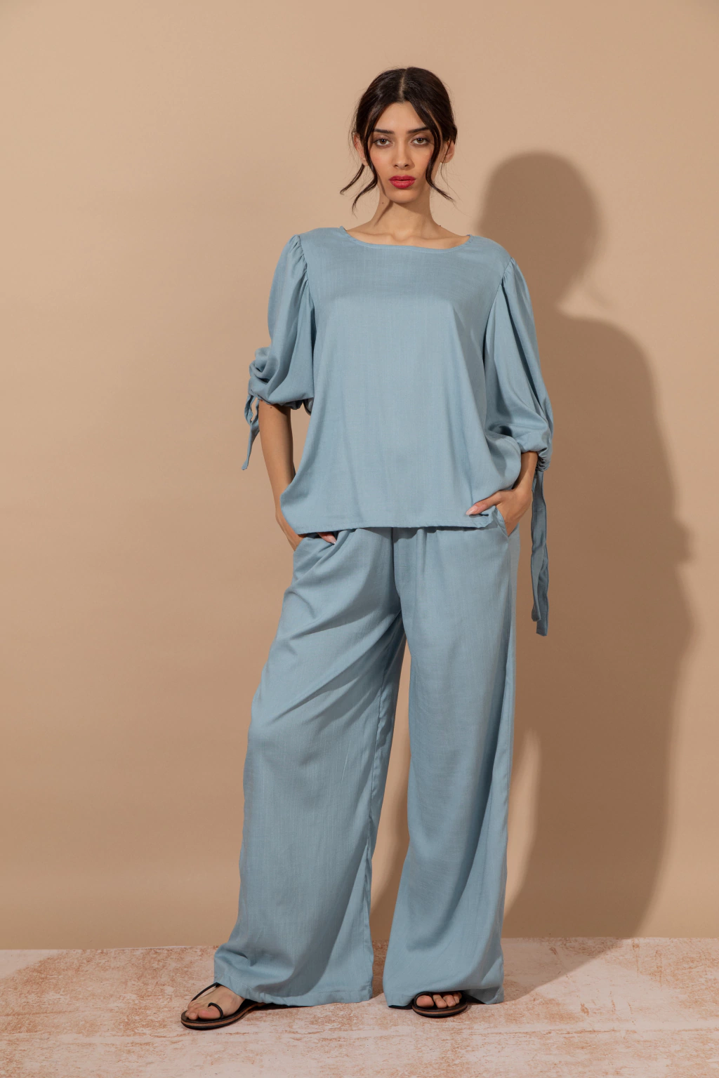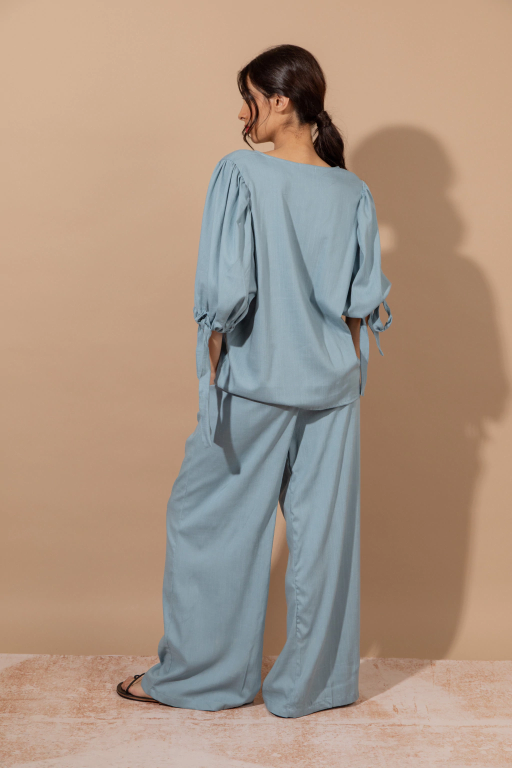 Blusa Bahia Celeste: Blusa de lino elastizado color celeste, con mangas amplias con lazo en el piño. Podes combinarlo con el pantalon wide leg Bahia o usarla con cualquier otra prenda ya que aporta comodidad,frecura y estilo.