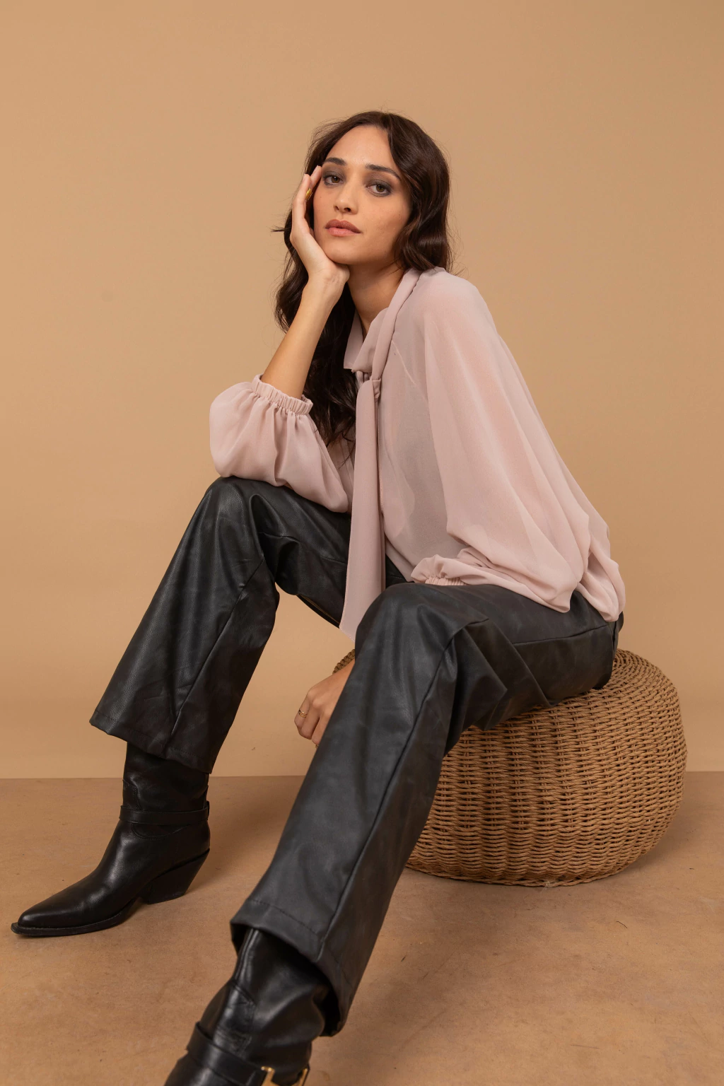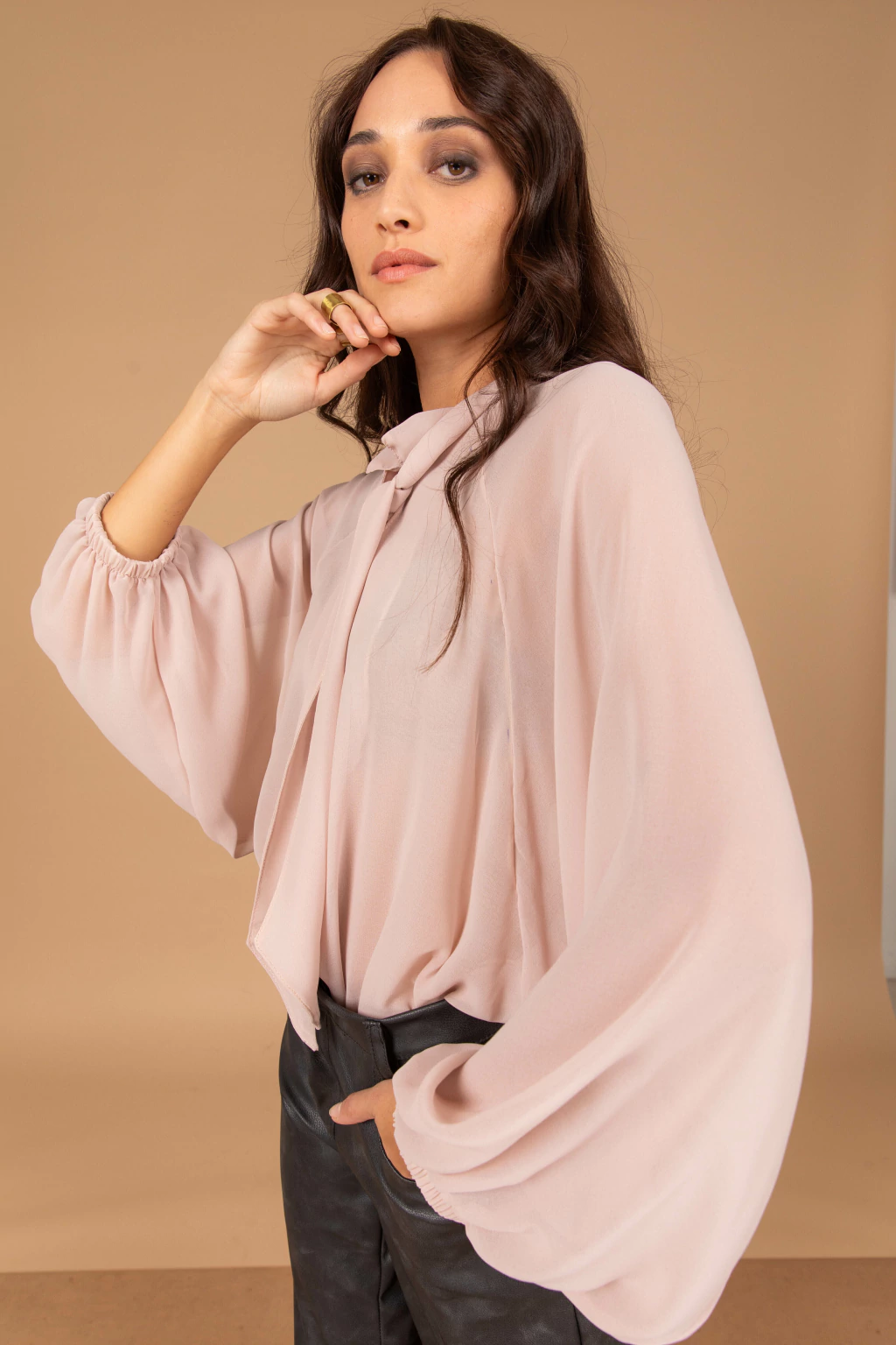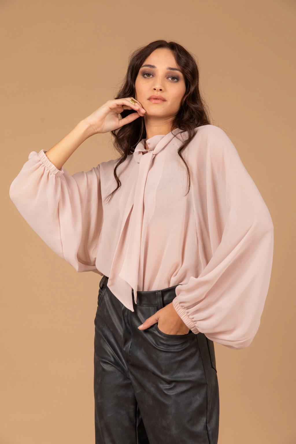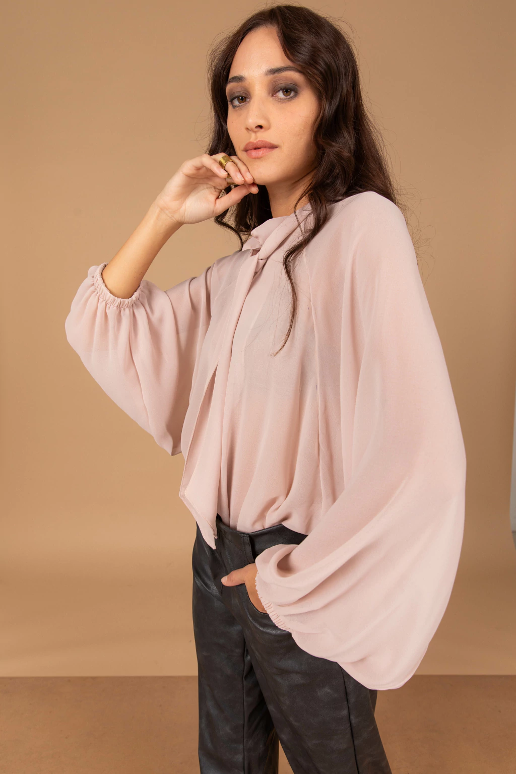 Descubre nuestra blusa de gasa rosa palo, una prenda fina y elegante que se adapta a cualquier ocasión. Su diseño amplio con caída favorece la figura, mientras que las mangas ranglán con elástico en el puño añaden un toque de comodidad. El cierre con botoncito en el frente y el corbatín extraíble le dan un estilo versátil y chic. Es amplia se adapta a cualquier talle.