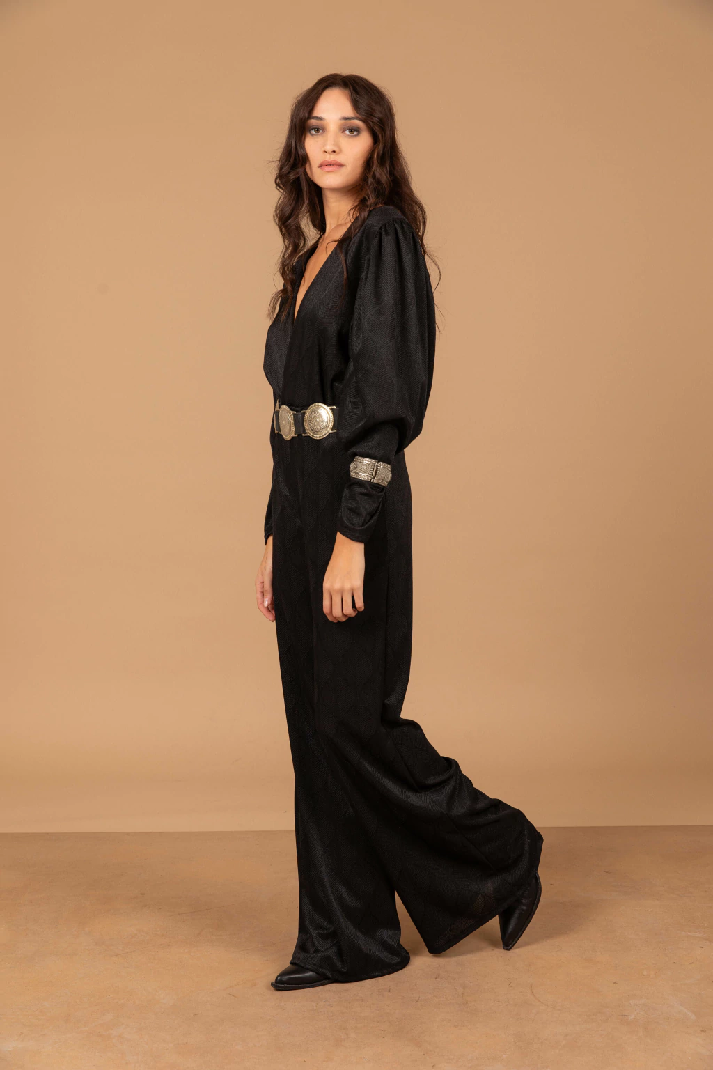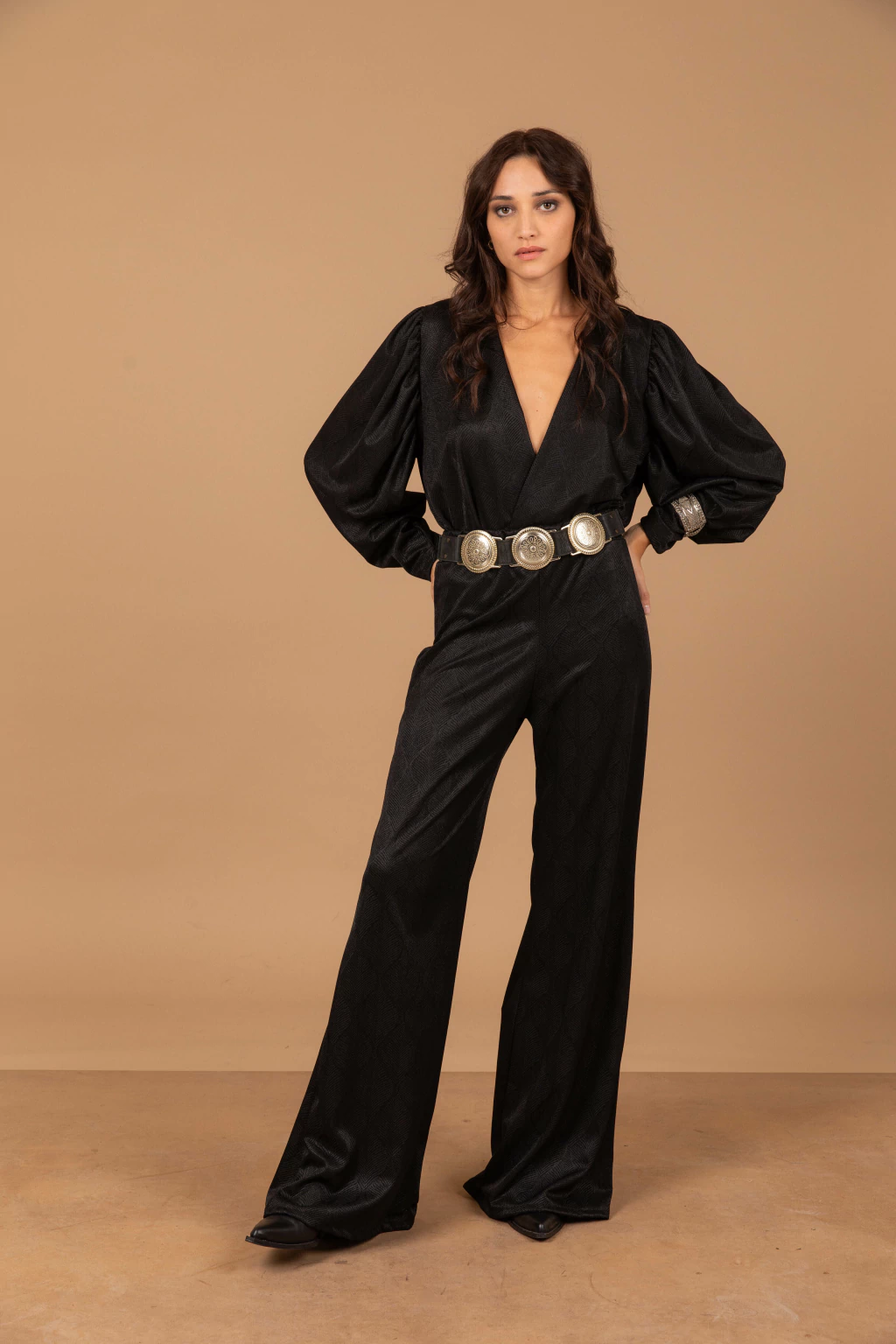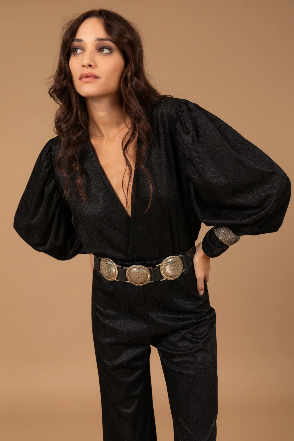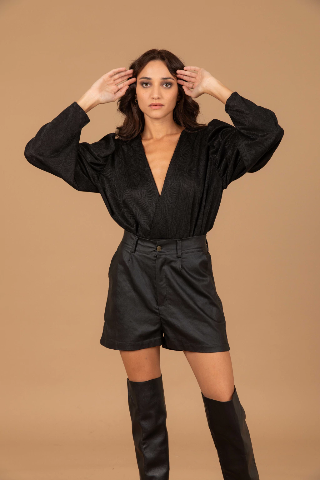 Este body de saten labrado negro presenta un escote cruzado y mangas globo que añaden un toque sofisticado. Ideal para diversas ocasiones, combina perfectamente con faldas o el Pantalon Valeriano.