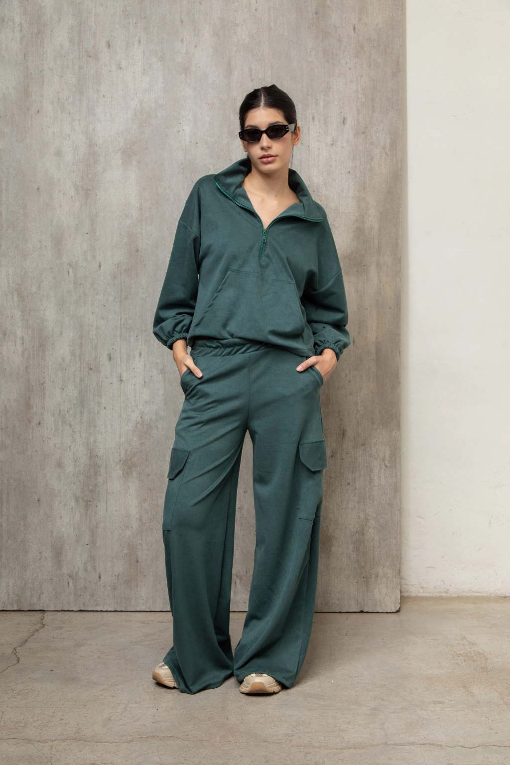 Buzo confeccionado con sastrero queen color verde, es una tela con una textura súper linda, es calentito y cómodo. Tiene cierre en el cuello, elástico en los puños y un elastico con presilla en la parte de abajo para ampliar o achicar la prenda. es un básico con onda. Podes completar el look con nuestro pantalón Tipa o usarlo con cualquier otra prenda.