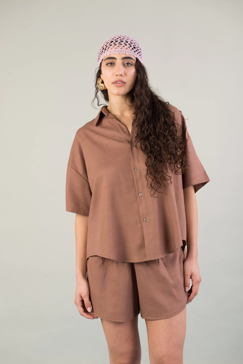 Camisa Arena chocolate, un diseño con un corte amplio, perfecta para tus looks de verano.Confeccionada en Lino, combina la liviandad del lino, ideal para todo el año. Cuello y apertura con botones y atras tiene una pequeña tablita para darle amplitud. Mas larga atras que adelante. Disponible tambien en color Chocolate y con estampa exclusiva de Annacherise