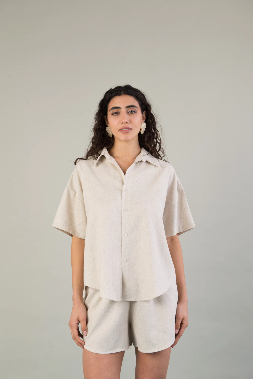 Camisa Arena offwhite, un diseño con un corte amplio, perfecta para tus looks de verano.Confeccionada en Lino, combina la liviandad del lino con una textura , ideal para todo el año. Cuello y apertura con botones y atras tiene una pequeña tablita para darle amplitud. Mas larga atras que adelante. Disponible tambien en color Chocolate y con estampa exclusiva de Annacherise