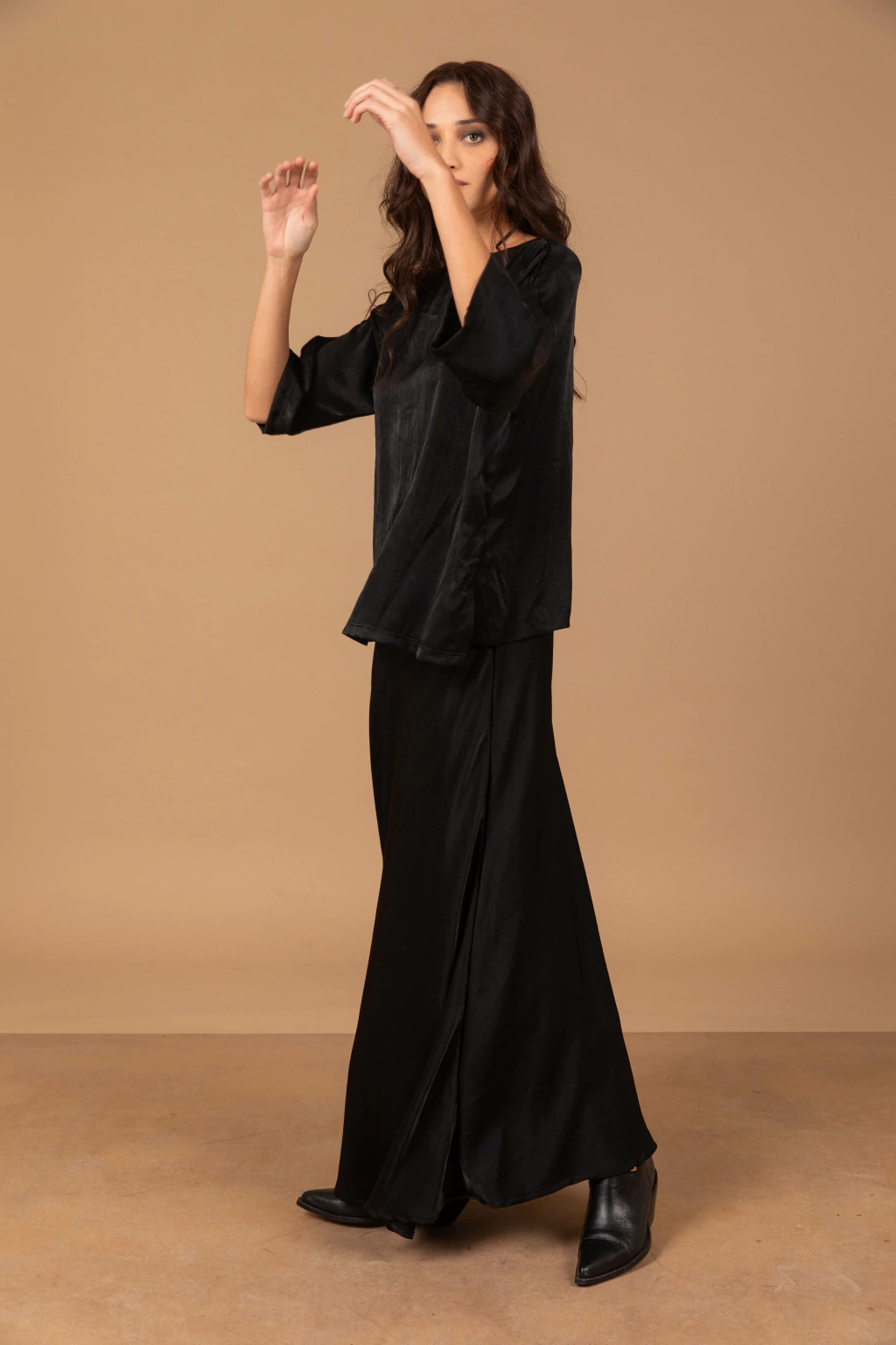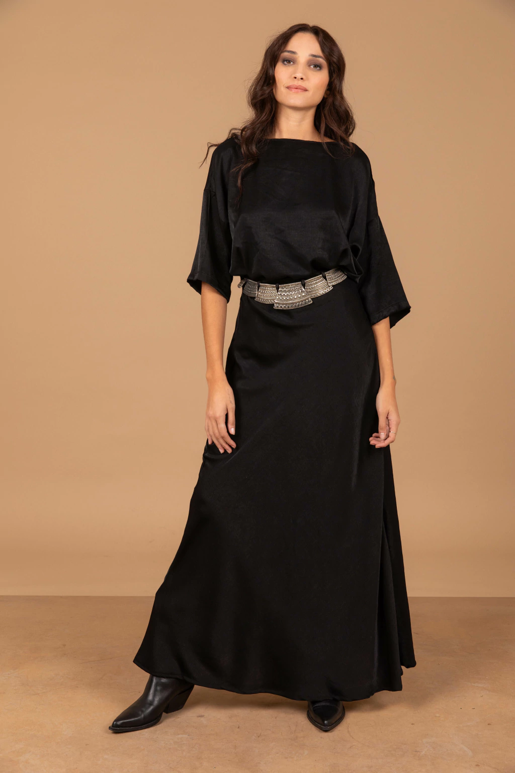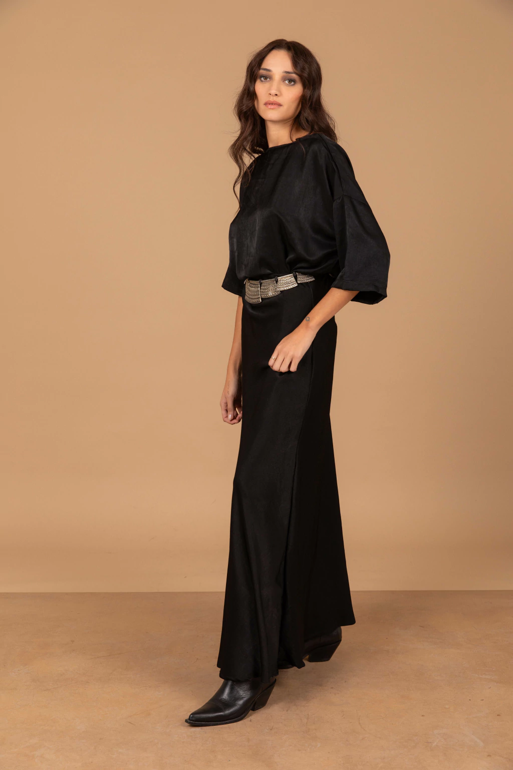 La falda esta nconfeccionado en tela satén de seda negra, presenta un corte al bies, brindando caída y suavidad.