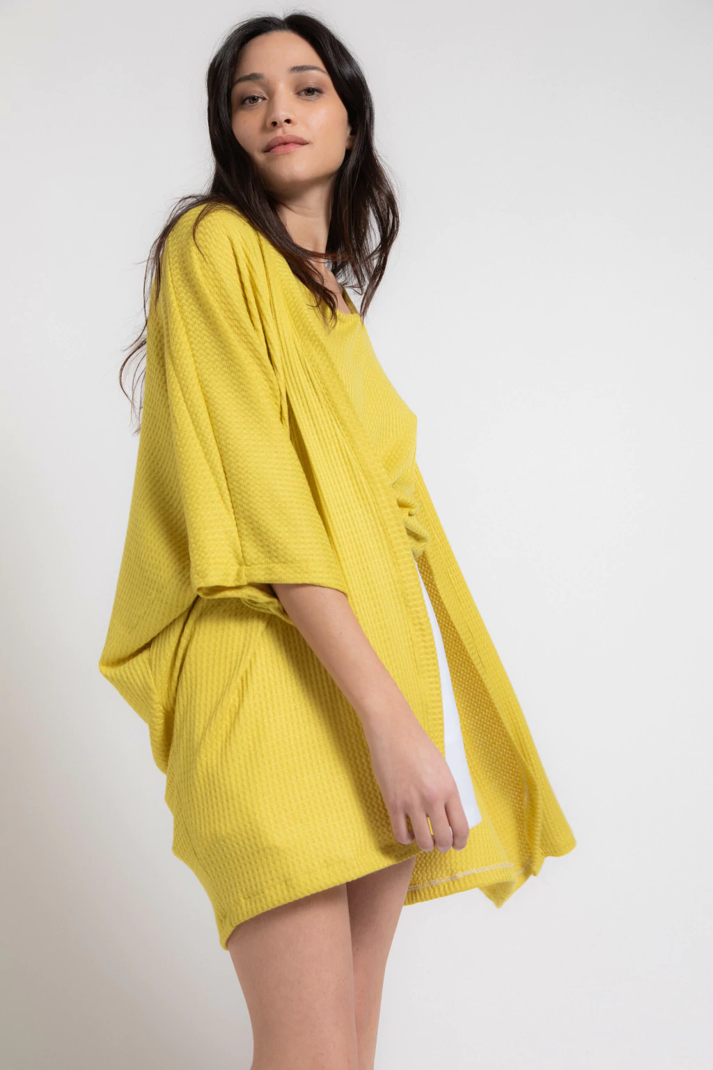 Kimono de wafle de punto color lima. Tiene manga murciélago, que le otorga a la prenda una amplitud que la hace cómoda y con mucha caída. Ideal para completar tus looks de las noches de verano.