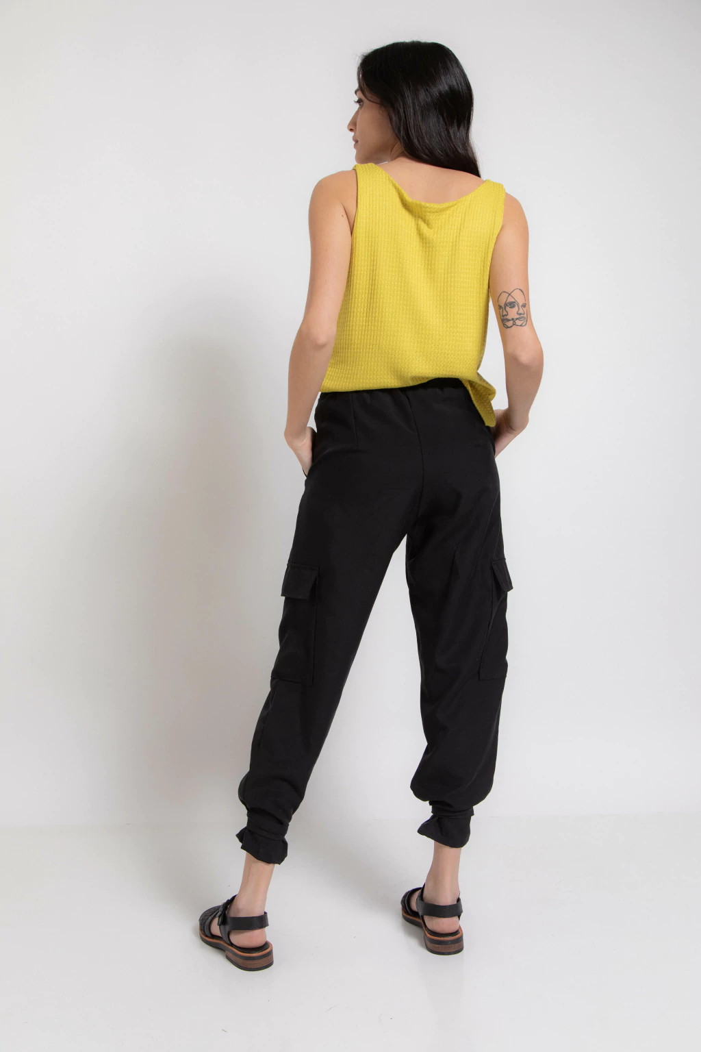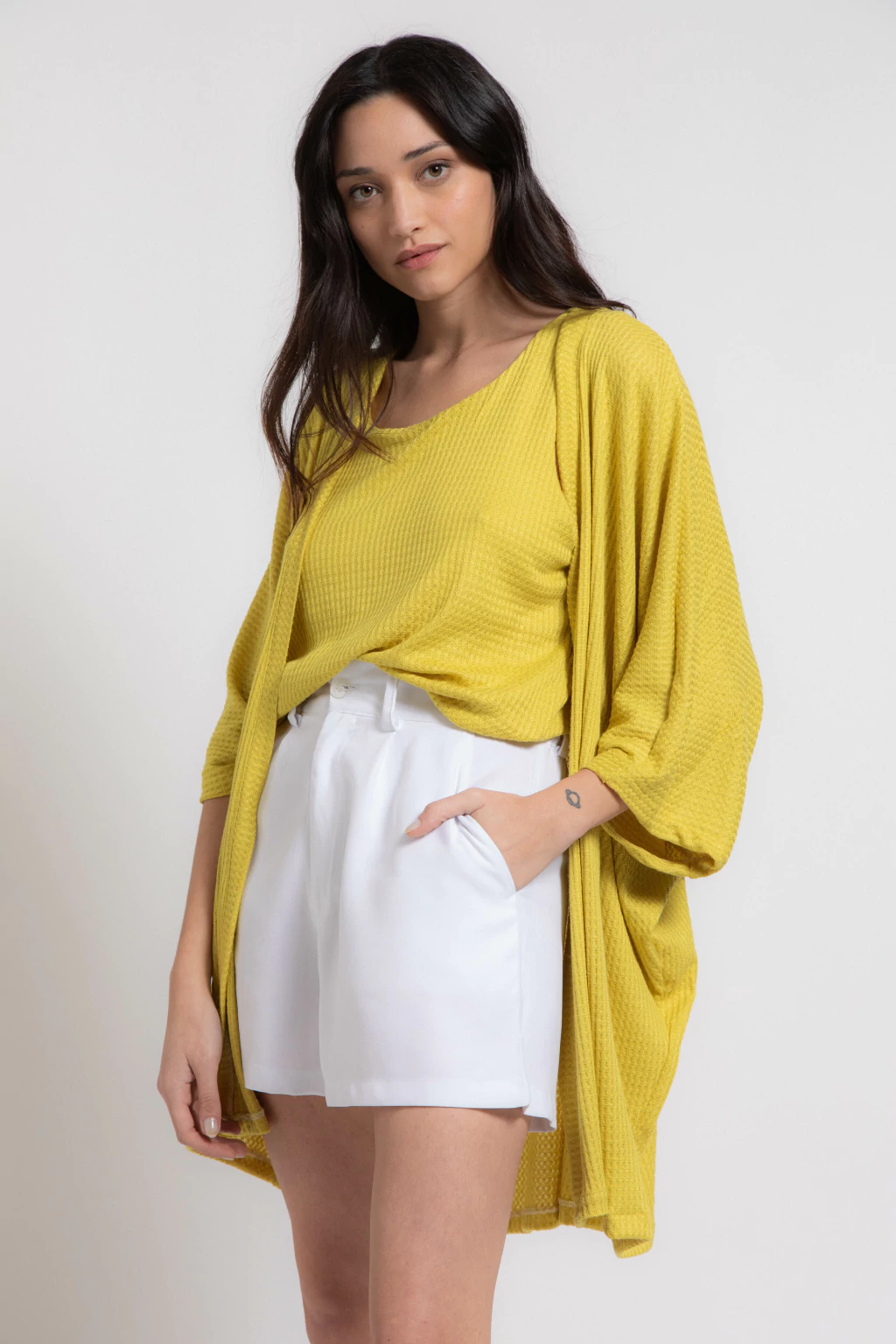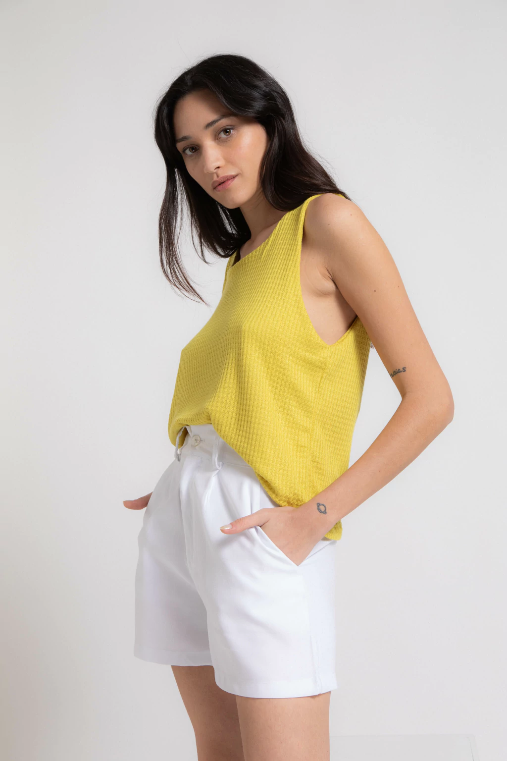 Musculosa de wafle de punto color lima, es bien elastizada, fresca, amplia y cómoda.