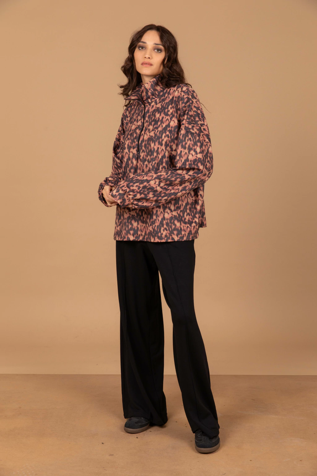La tela rústica con friza caída proporciona una sensación de confort absoluto. El pantalón palazo cuenta con bolsillos laterales y una costura central que estiliza la figura.