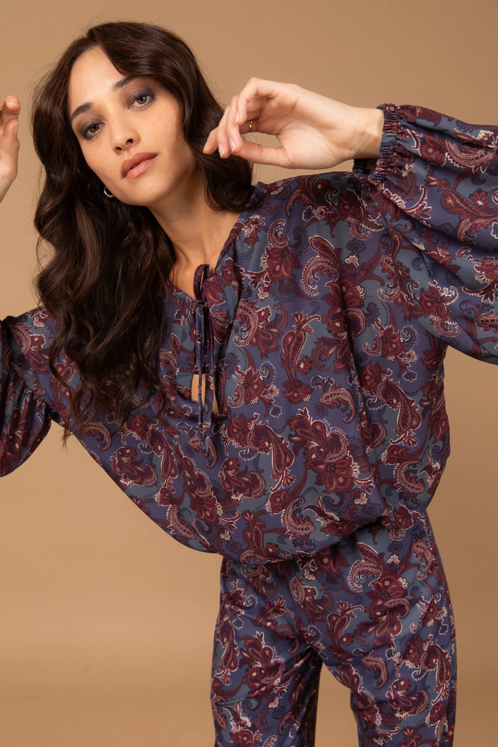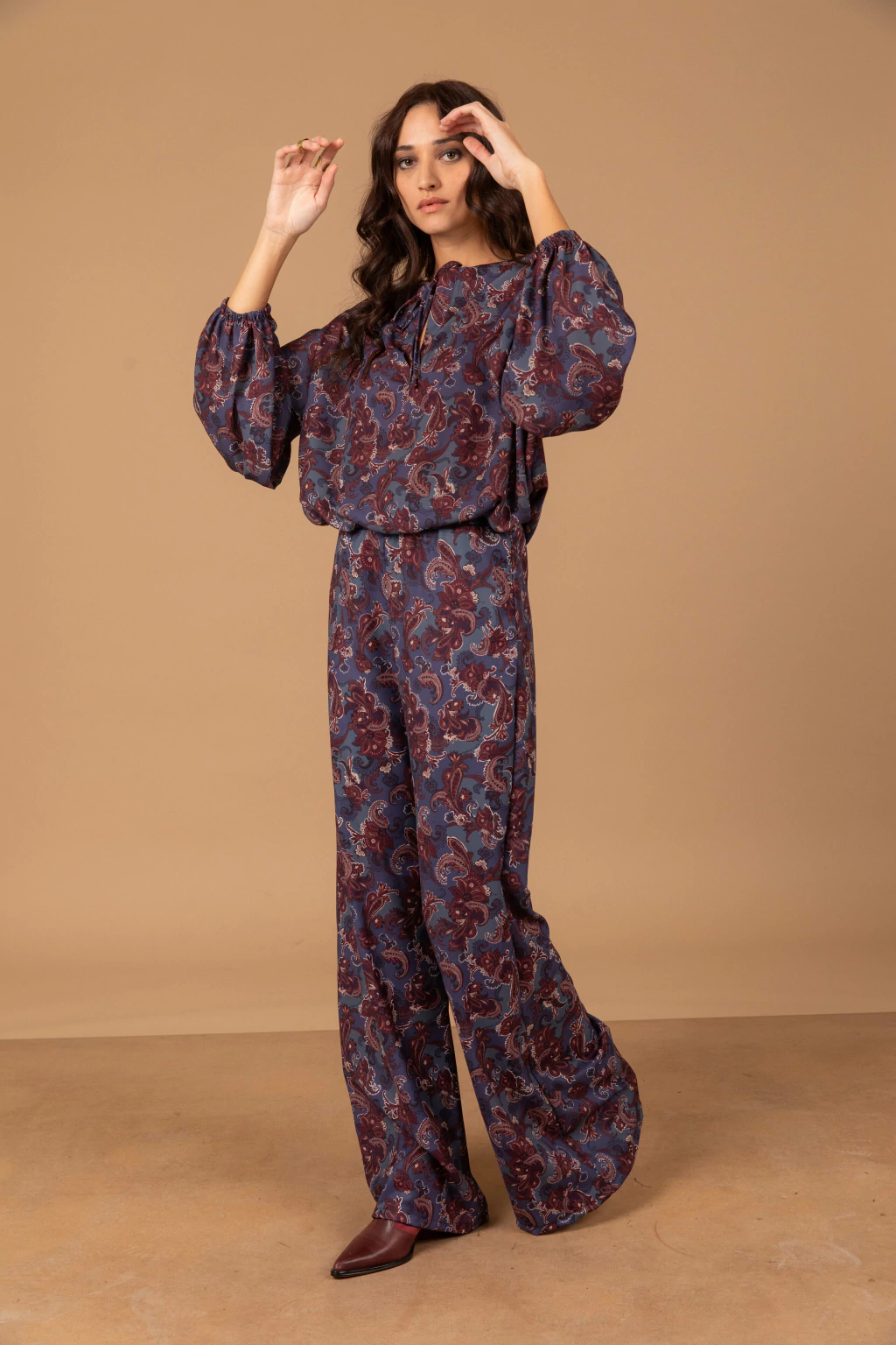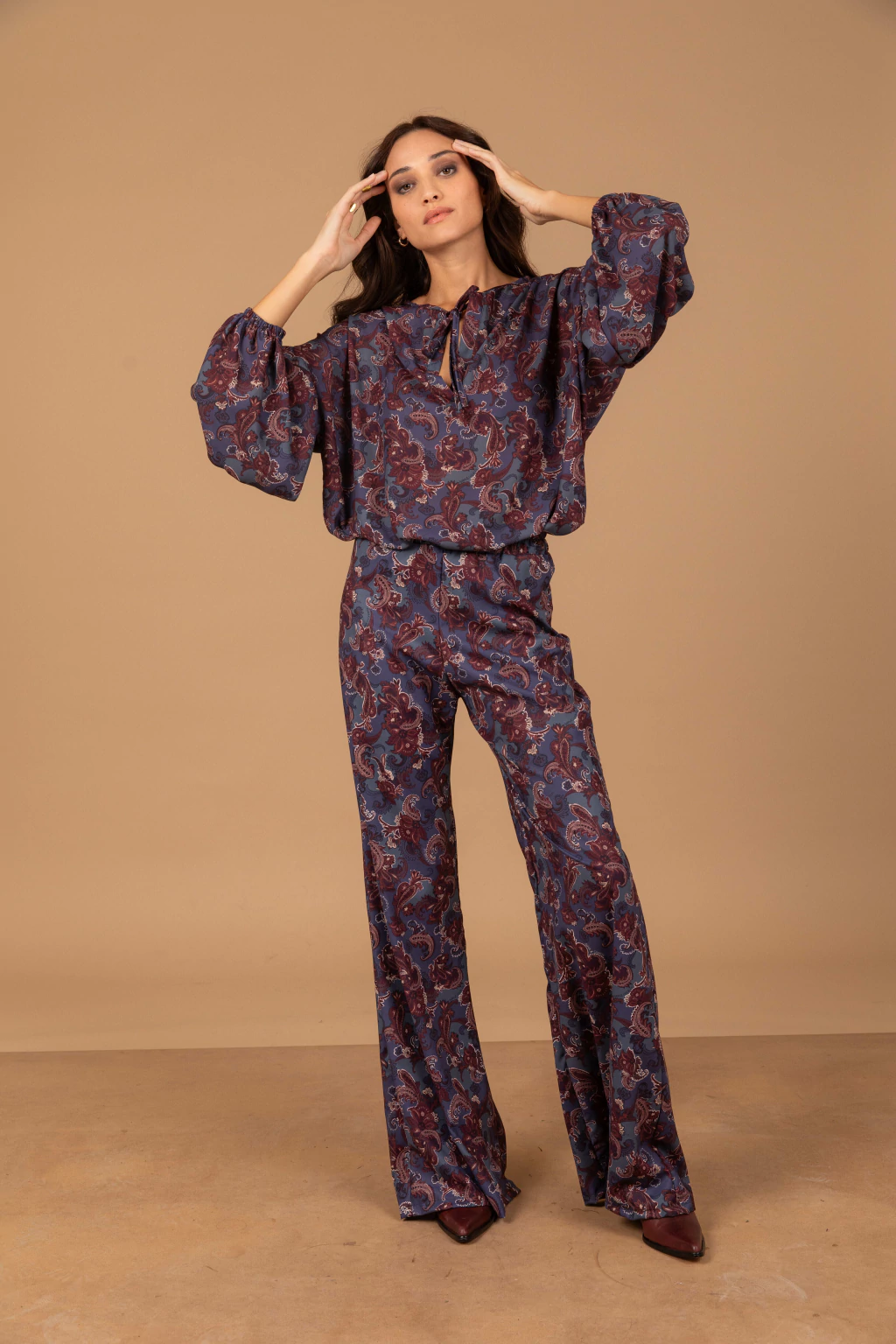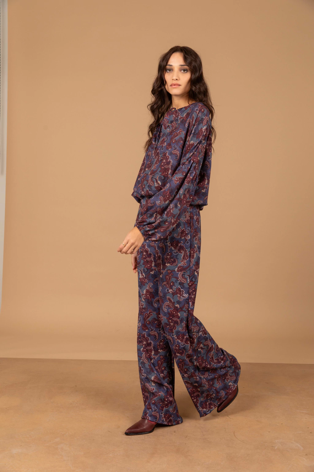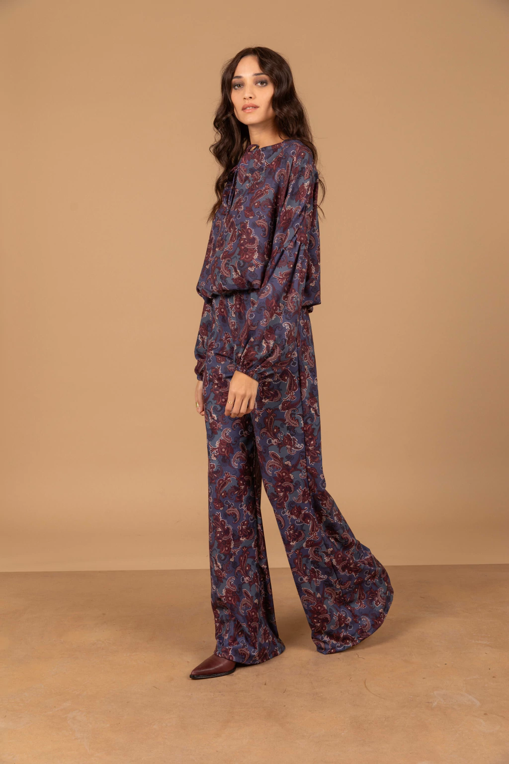 El pantalón tipo semi oxford complementa este conjunto, con un elástico en la cintura que brinda comodidad y un tiro alto que estiliza la figura. Este diseño sin bolsillos mantiene la línea limpia y sofisticada.