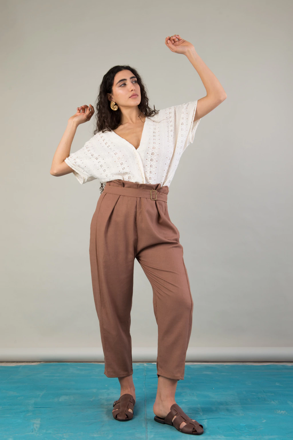 Pantalon cofeccionado en Lino, calce comodo de silueta levemente bombe, cintura regulable con hebilla, tiene cinto, lo ajustas como mas te guste. Diseño moderno que aporta versatilidad a cualquier look. Disponible en color Off white; Chocolate y Negro
