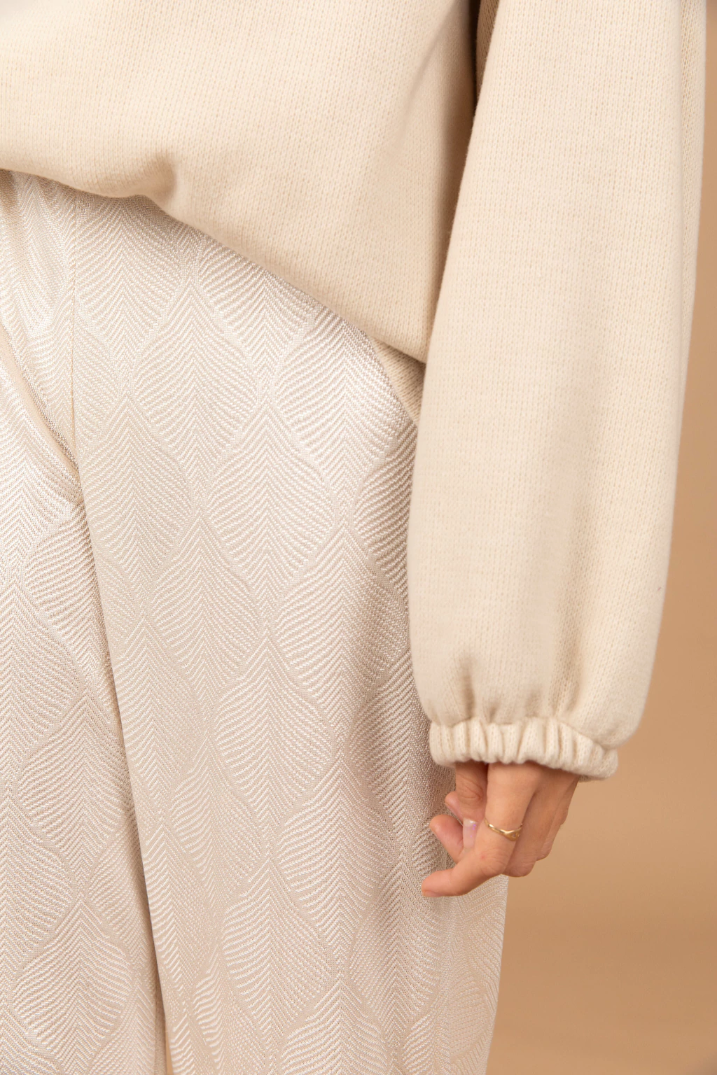 Este pantalón está confeccionado en Jacquar de satén con brillo, off white, un toque de elegancia y confort para tu armario, ofrece una caída pesada que no marca.