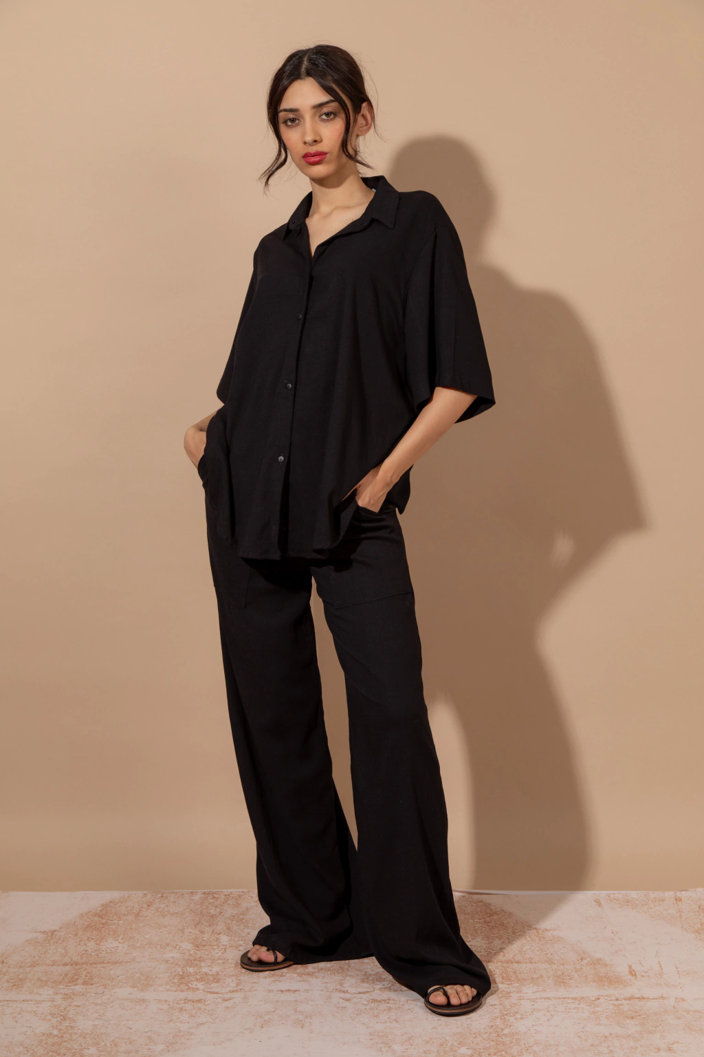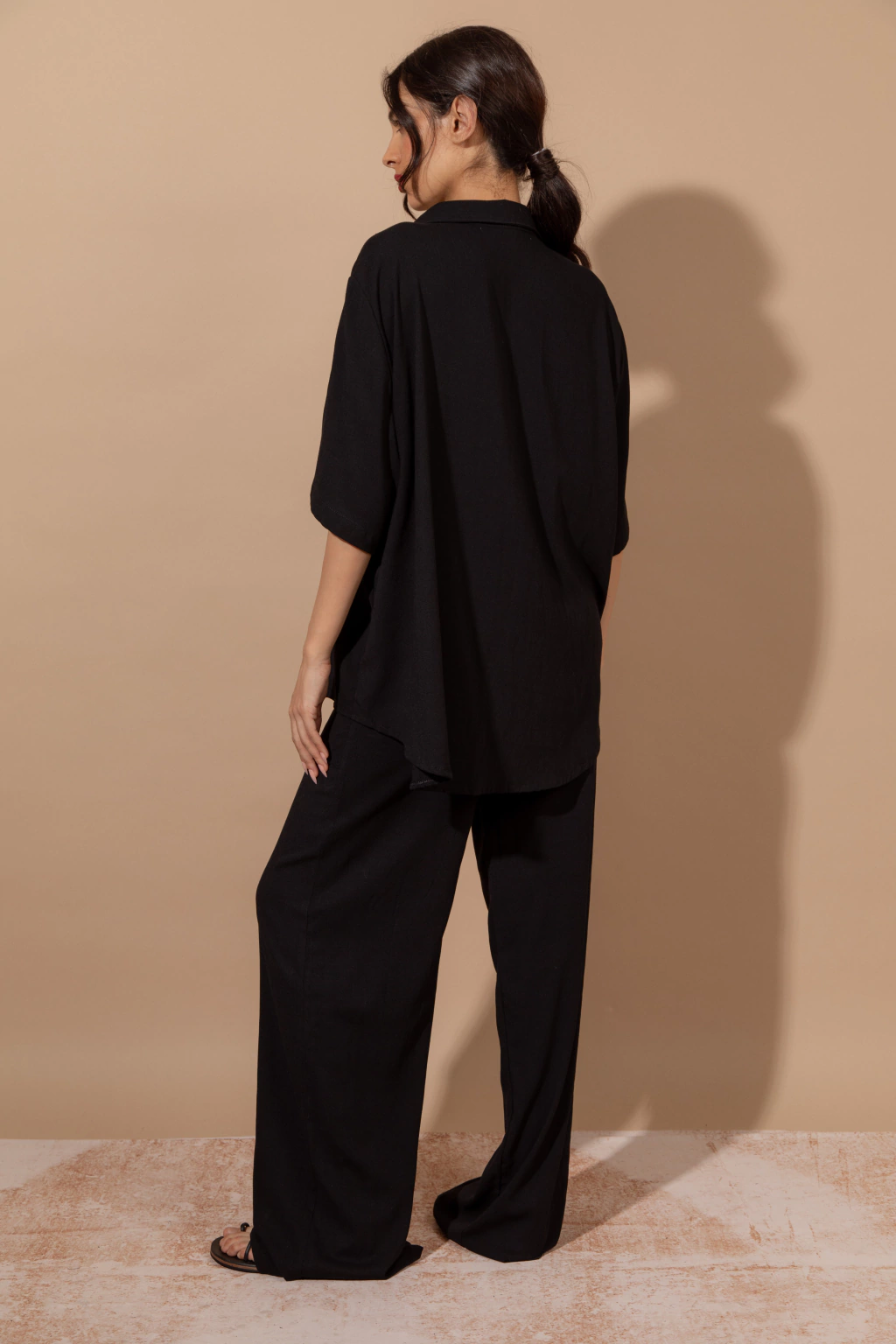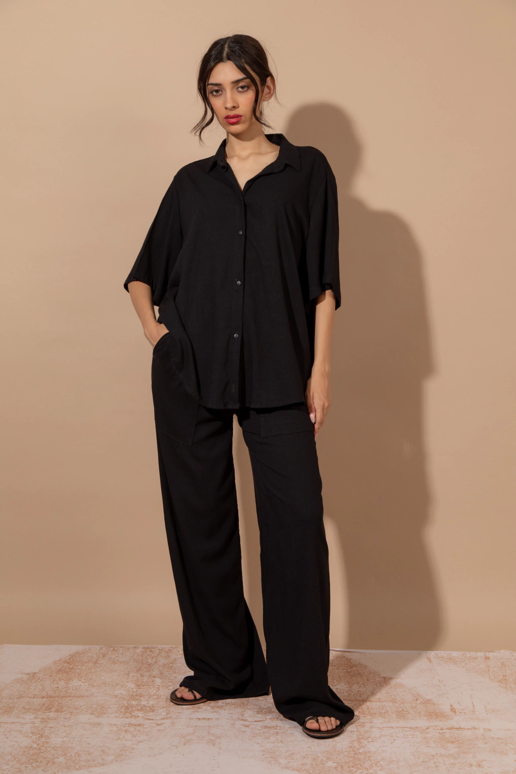 Pantalon Terre Negro: Pantalón amplio tipo palazzo confeccionado con Lino con spandex color negro. La tela tiene mucha caída. Nos encanta el pantalón Terre por su versatilidad y comodidad, lo podes usar con La Camisa Terre, para un look de día o con el Top volados Terre para la noche. Agregale los accesorios que mas te gusten y listo!! Tiene bolsillos delanteros y elástico en la cintura. Lo amamos!