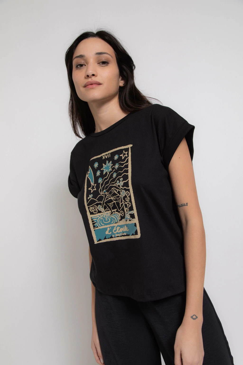 Remera de jersey de algodón con estampa exclusiva A&C, carta de Tarot. Es ideal para tus looks de verano cómoda, canchera y fresca. Es ampllia. Tiene un doblez en la manga.