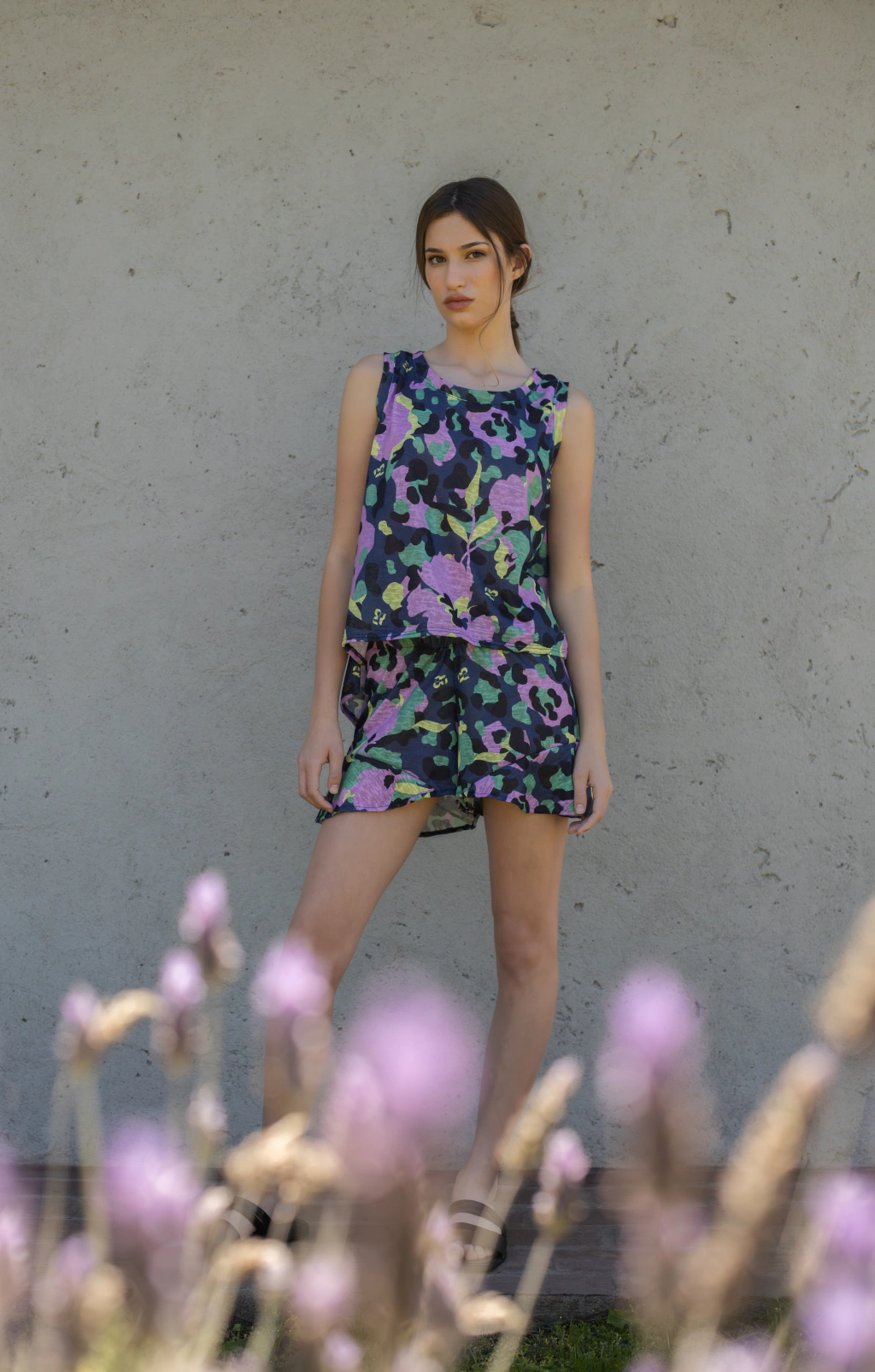 Musculosa confeccionada en jersey flamé de punto, tiene un corte irregular es más corto de adelante y más largo de atrás. Es muy fresca y cómoda. Tiene re linda caída. Estampa propia de Anna&cherise.