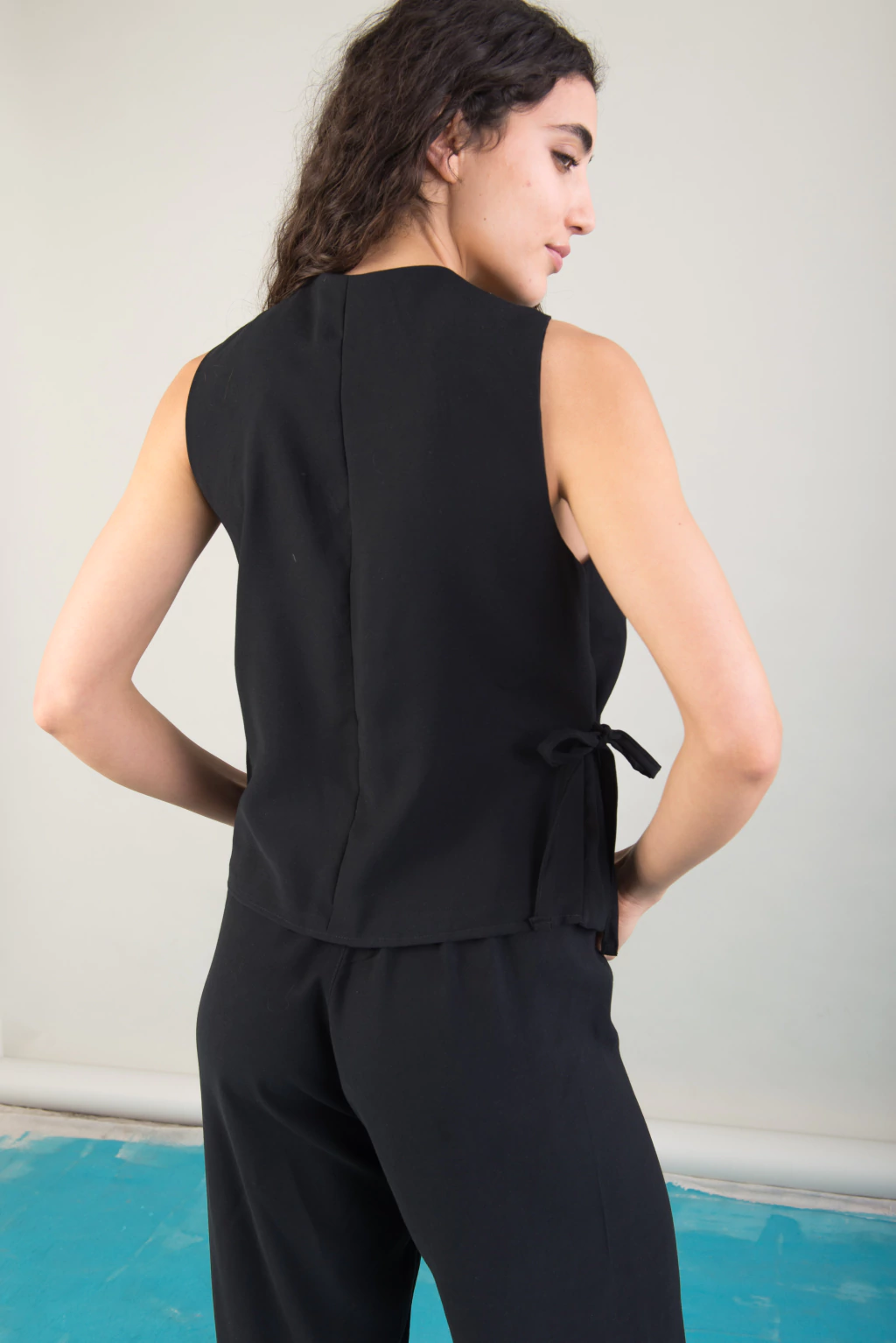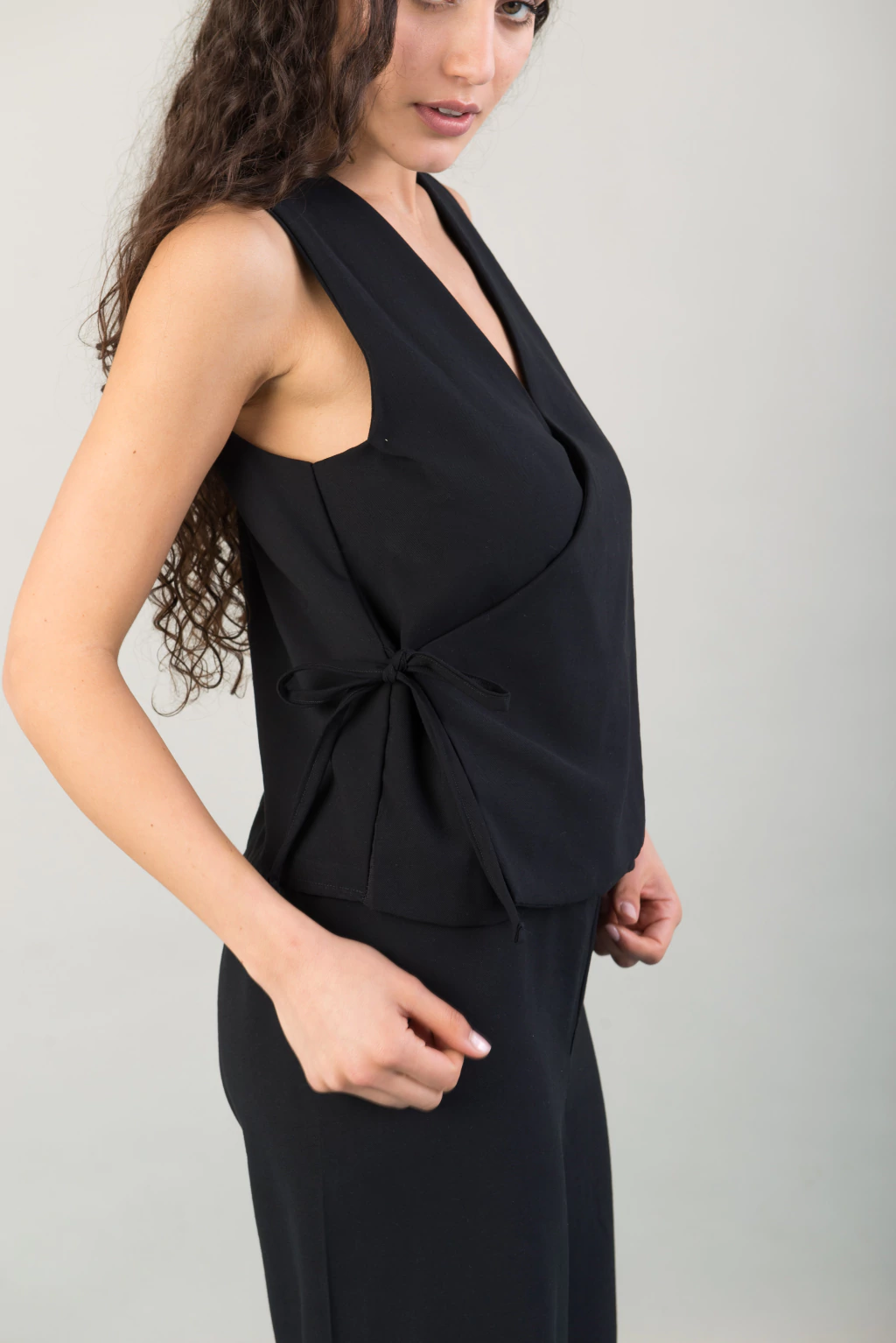 Chaleco Mystic negro, una prenda versátil que podés usar también como blusa. Su diseño con tiritas regulables te permite ajustarlo a tu gusto, brindando comodidad y estilo. Confeccionado en tela twill con peso, fresca y atemporal, su textura única no brilla, ideal para cualquier momento del día o la noche. La podes usar en Set con el Pantalon Mistyc sastrero negro queda increible.