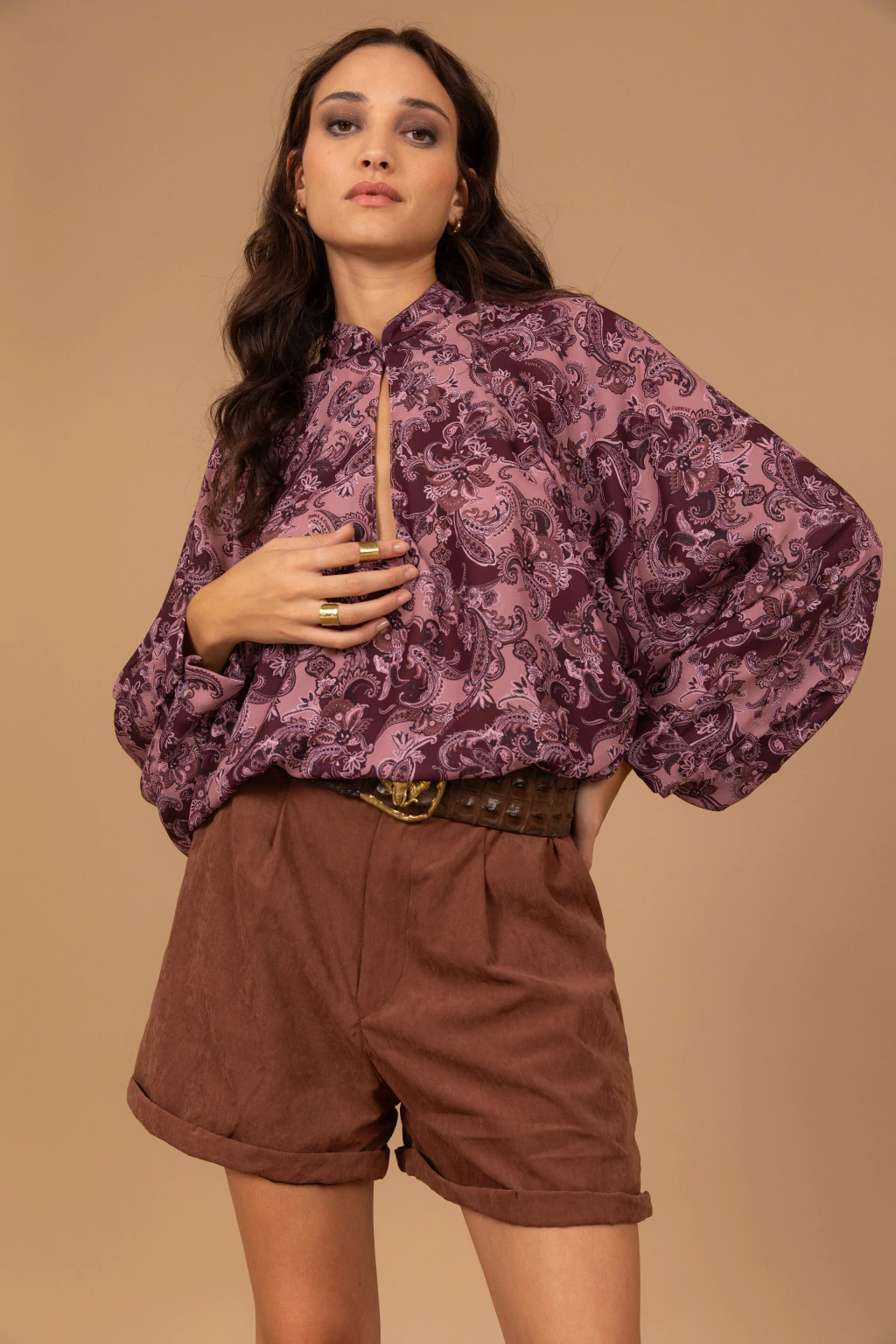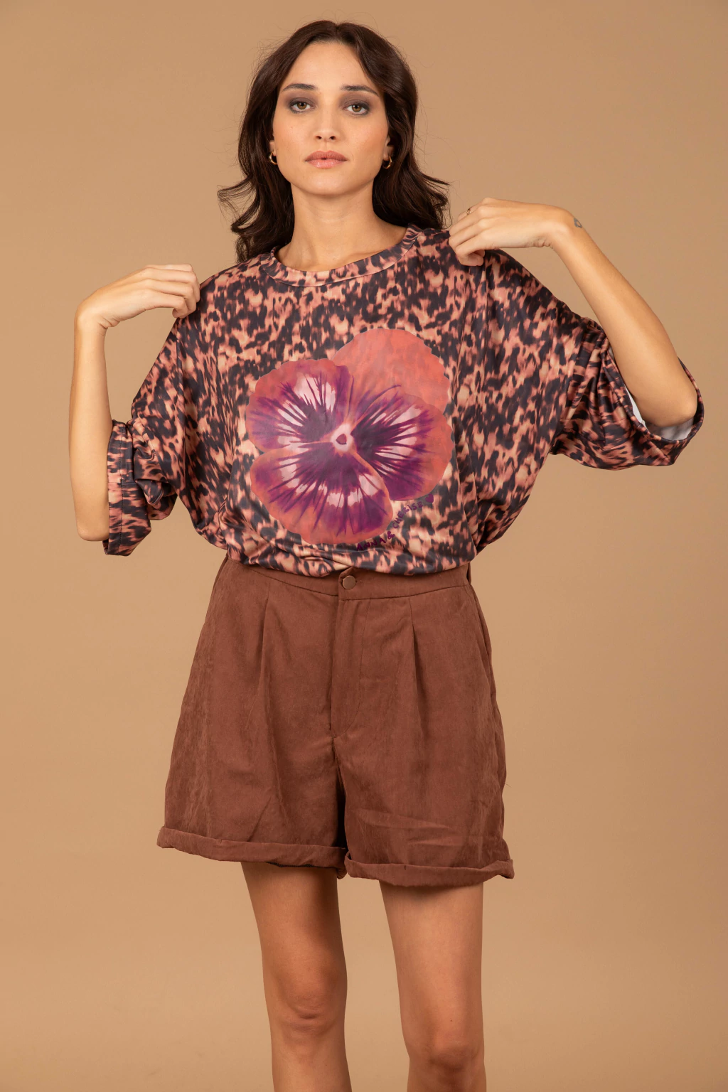 Short confeccionado con sastrero vintage gamuzado color chocolate. Tiene botón, cierre y bolsillos en la parte delantera. Es estilo sastrero. En la parte de atrás de la cintura tiene elástico lo que permite que se estire más la cintura se adapte mejor y sea más cómodo.