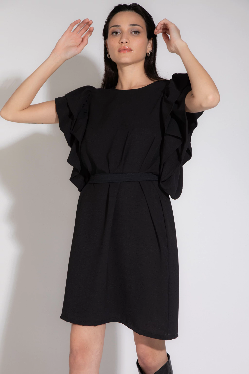 Vestido confeccionado en creppe de seda negro con doble volado en la manga.