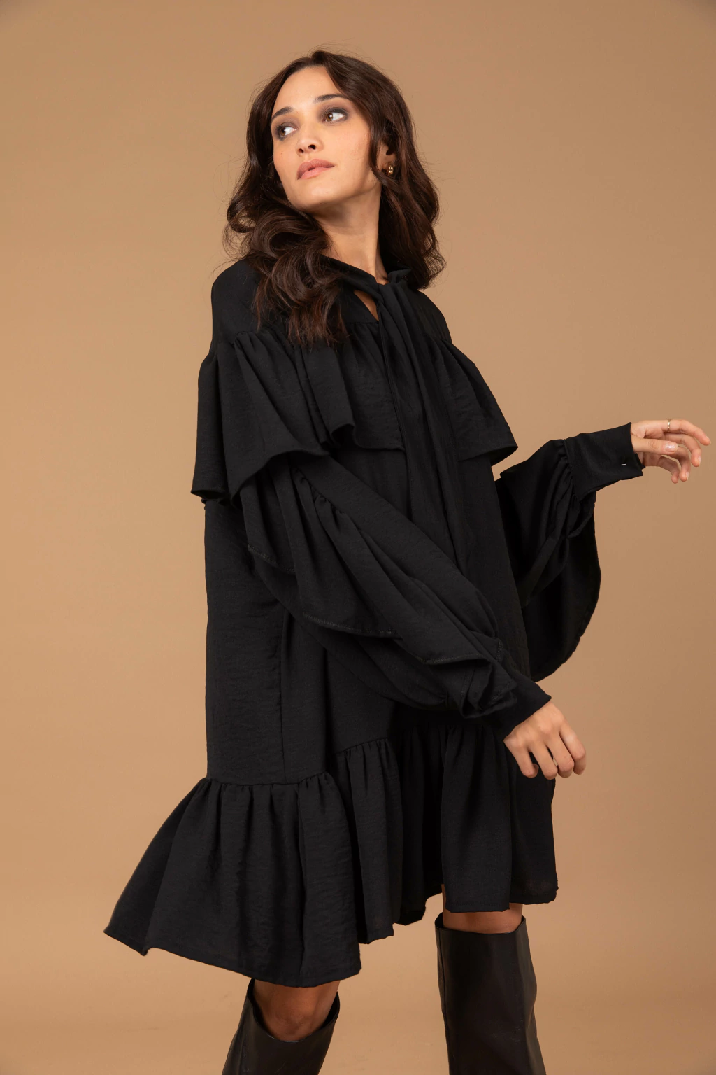 Mangas largas con puño ancho y cierre con botones. El corbatín en el cuello y el volado en el bajo añaden un toque. Ideal para usar con botas o mocasines, segun tu estilo.