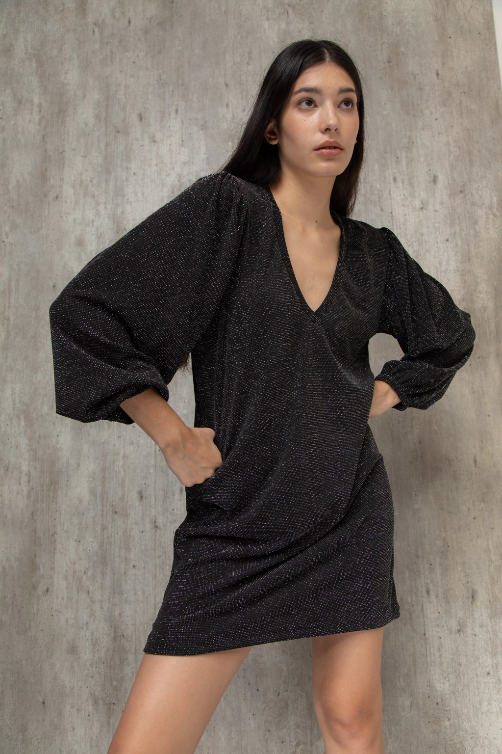 Vestido confeccionado con lúrex elastizado, tiene cuerpo la tela y una caída súper linda. Ideal para un look de noche, podes usarlo con o sin cinto. Tiene escote en V y la manga ancha con elástico en el puño.