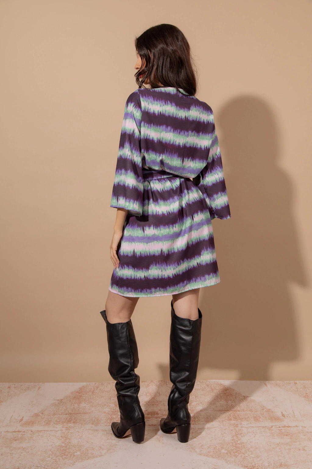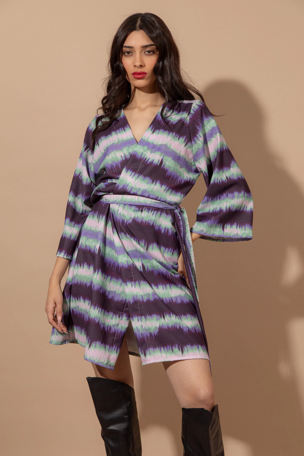 escote en V, con tiras que cruzan, mangas 3/4. Ideal para un evento de dia o de noche según como armes el look.