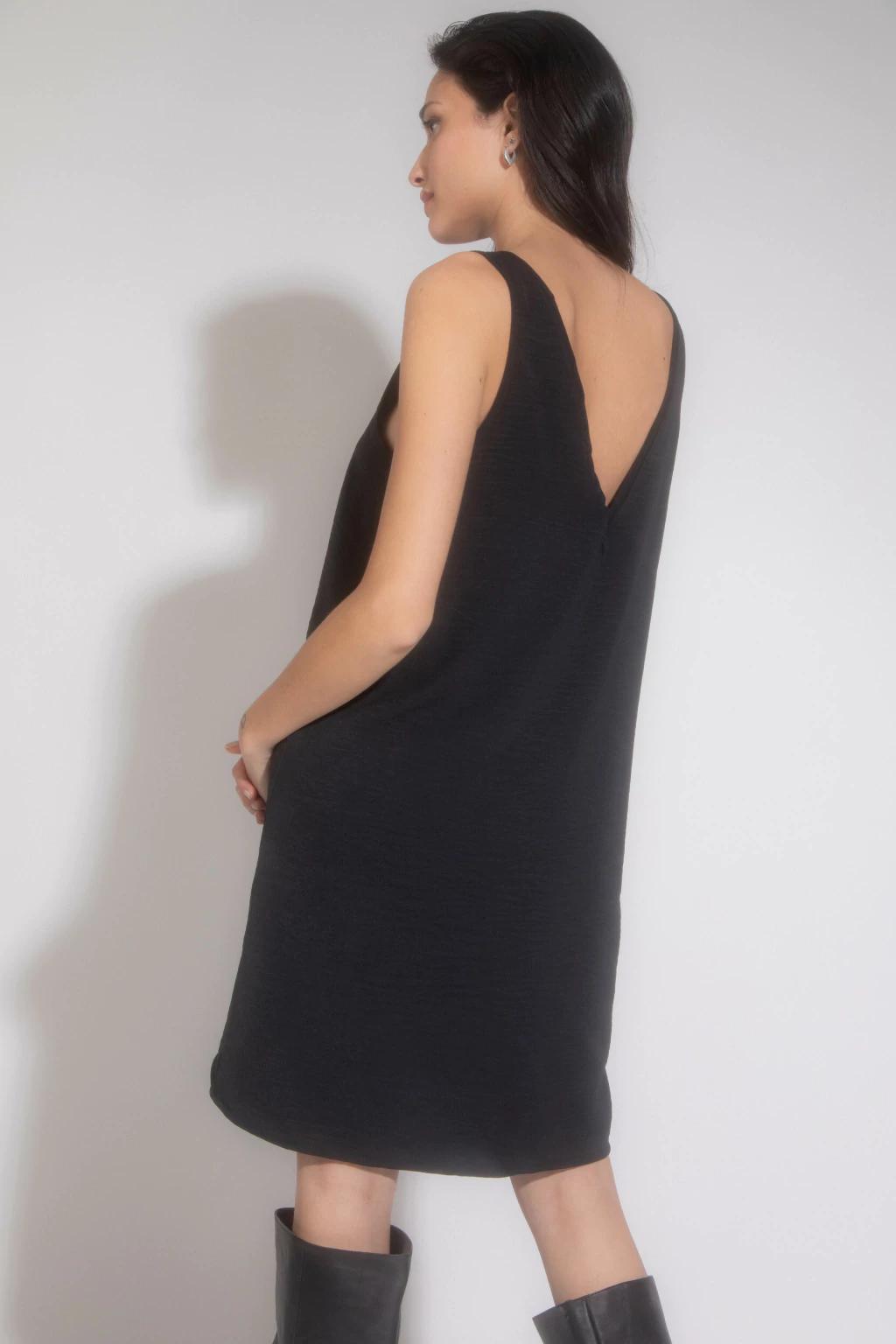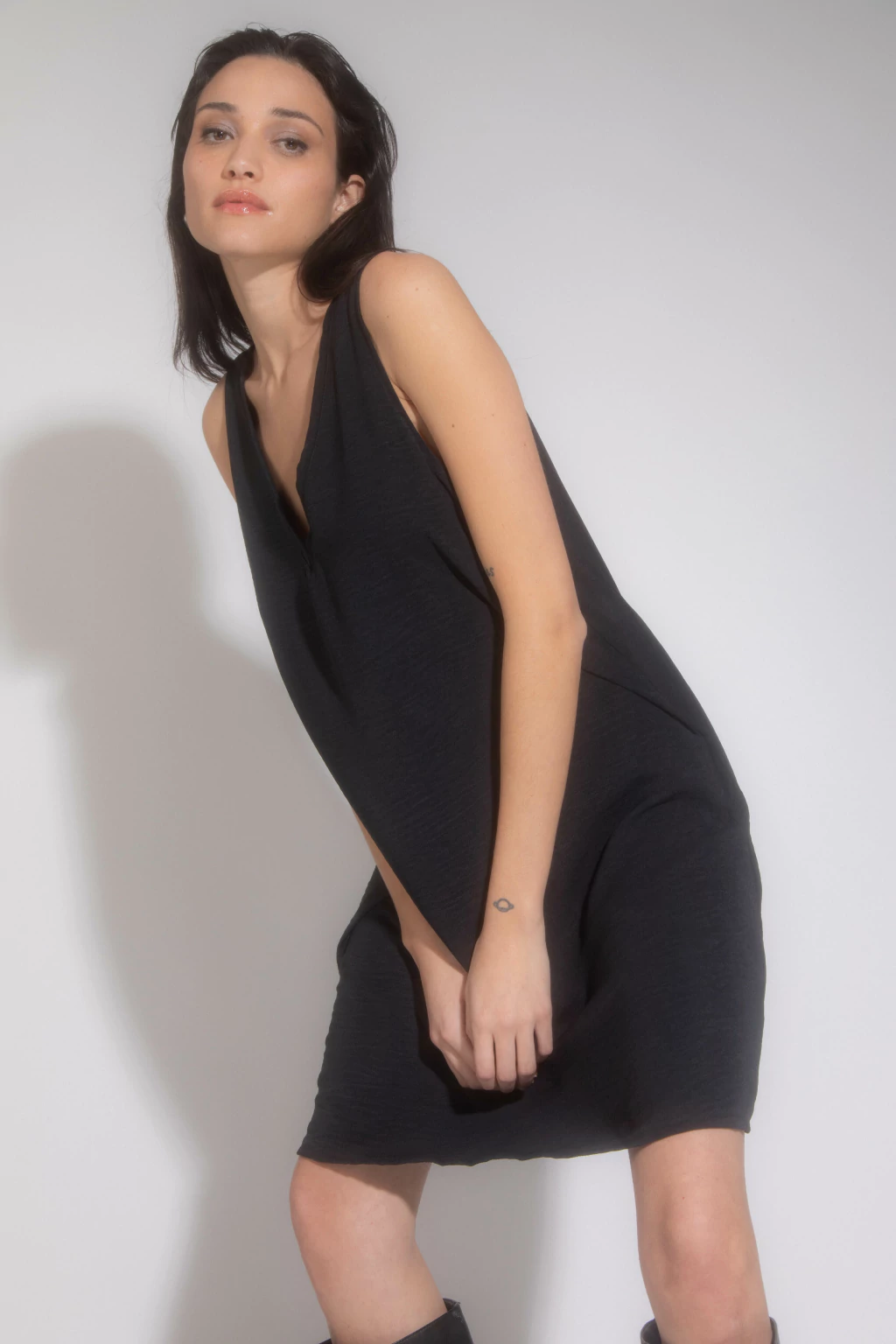 Vestido confeccionado en creppe de seda negro. La tela tiene muy linda caída y un poquito de brillo.