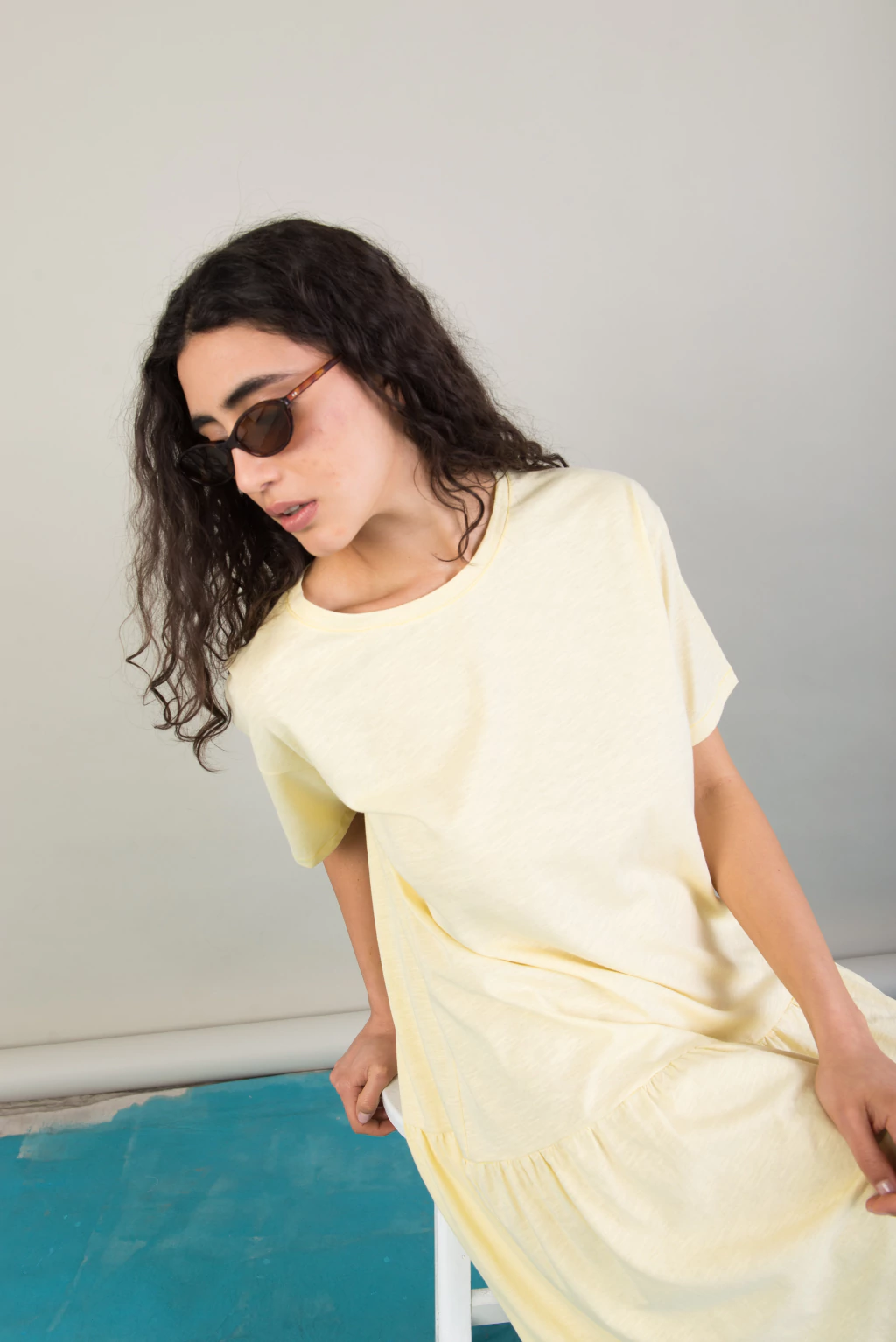Vestido confeccionado en jersey flamé amarillo mantequilla. Aplio, fresco cómodo.