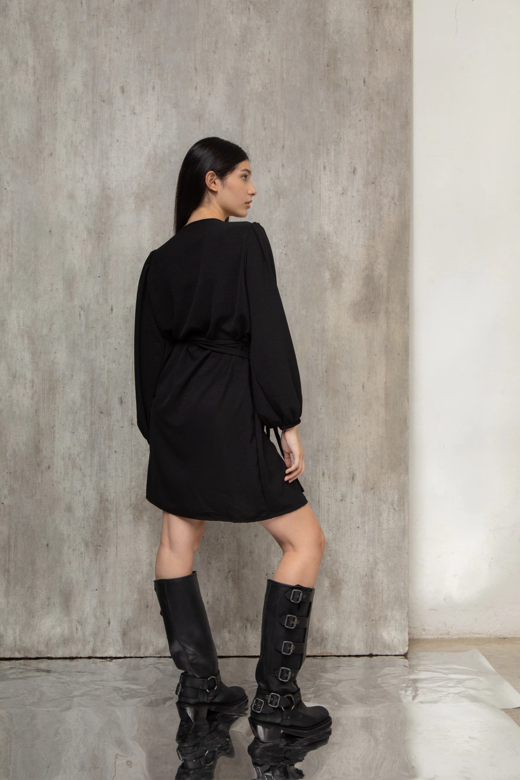 Nuestro vestido Petunia está confeccionado con twill de seda color negro, tiene tiras que cruzan a los costados y vos le das la apertura que quieras. Tiene caída y es super cómodo.