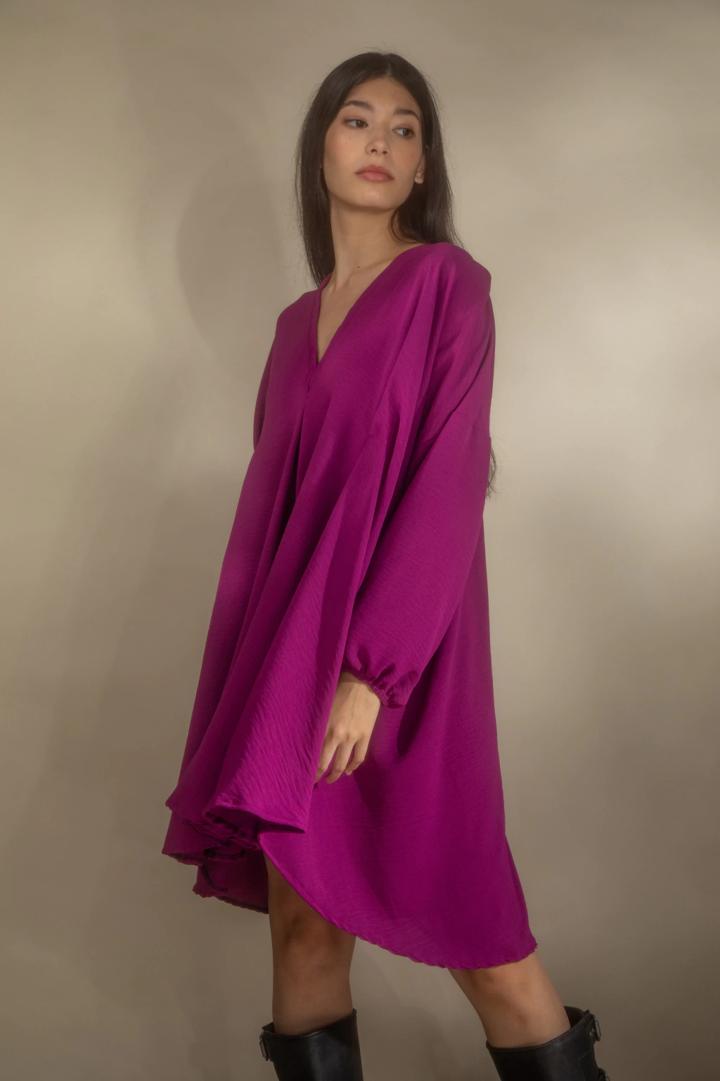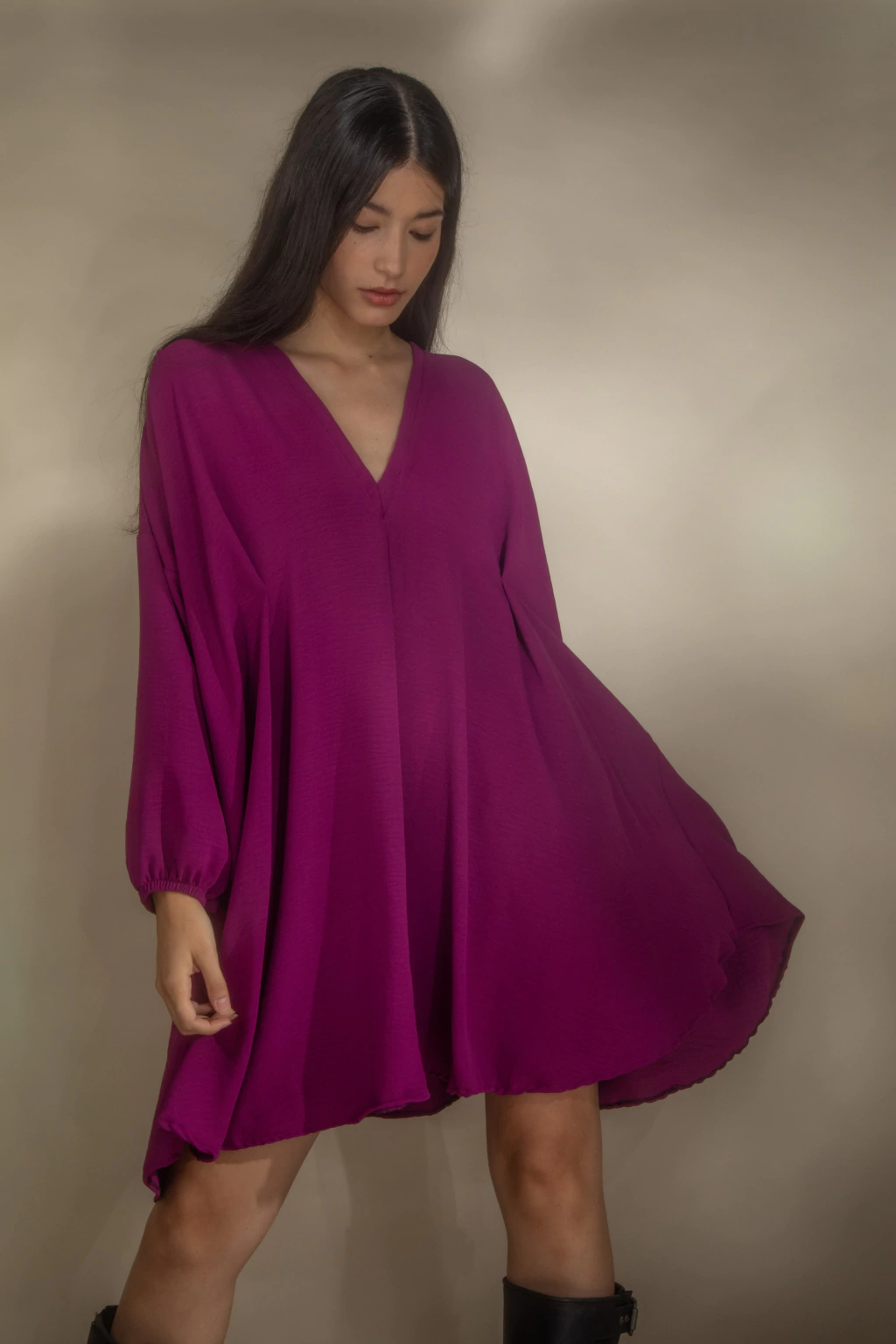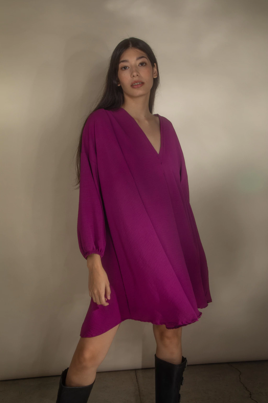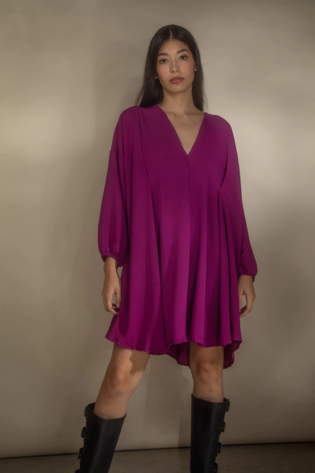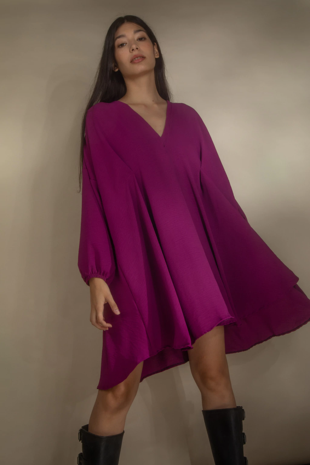 Vestido corto de twill , con frunces en la parte de adelante. Escote en V, manga caída con elástico en el puño, irregular, mas largo detras. El vestido es súper amplio, mirar bien el largo de el T2 porque es largo.