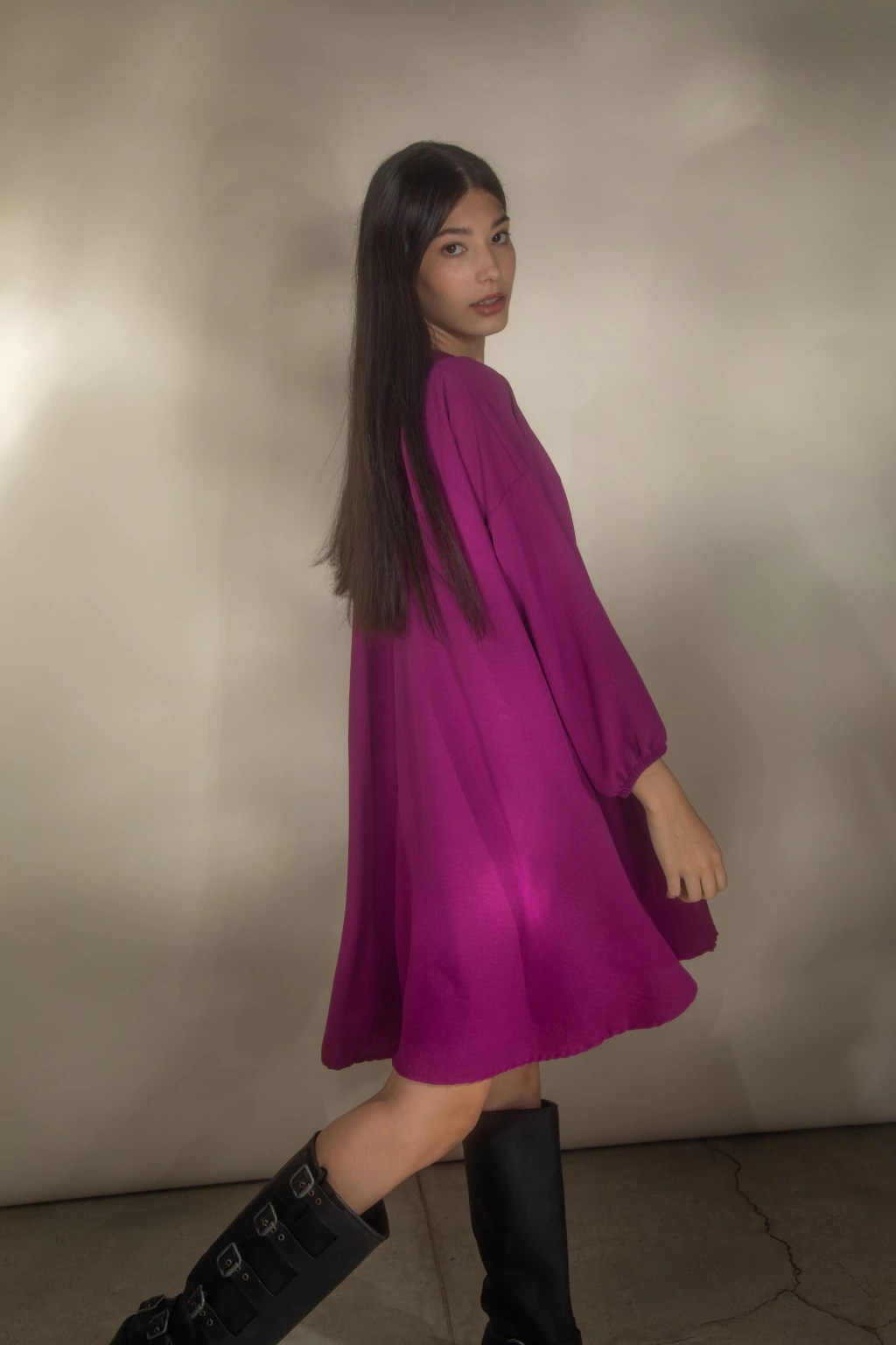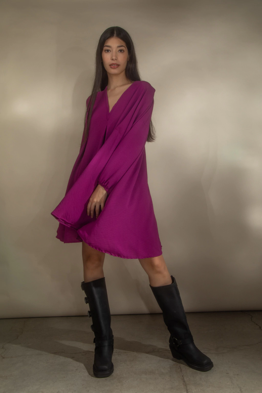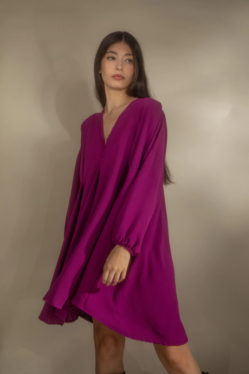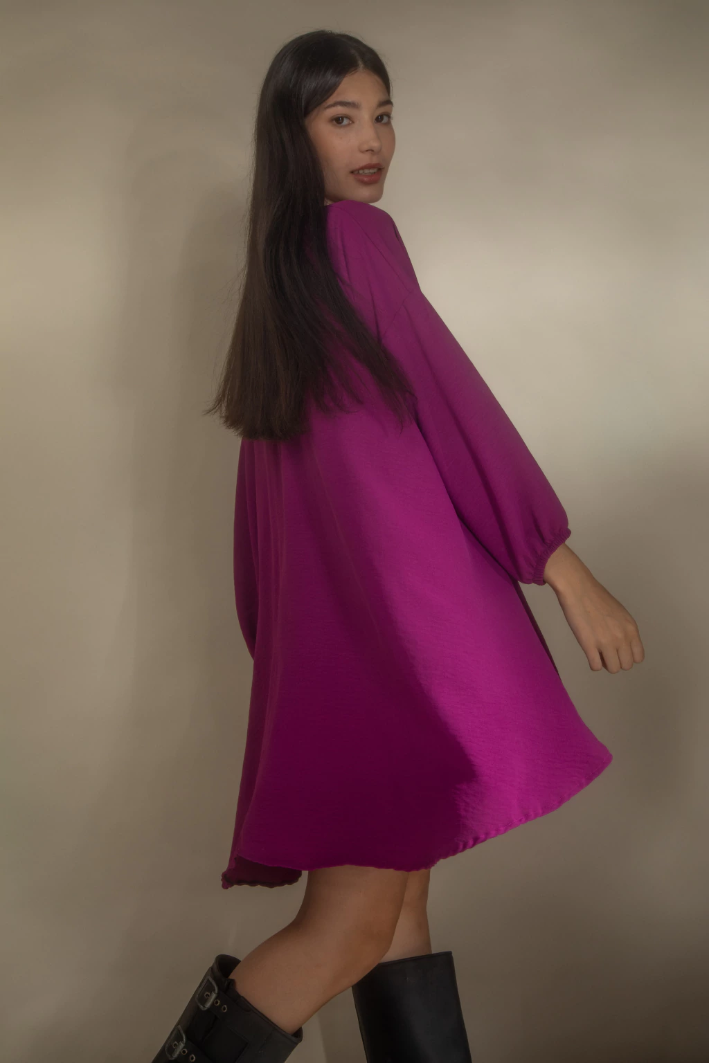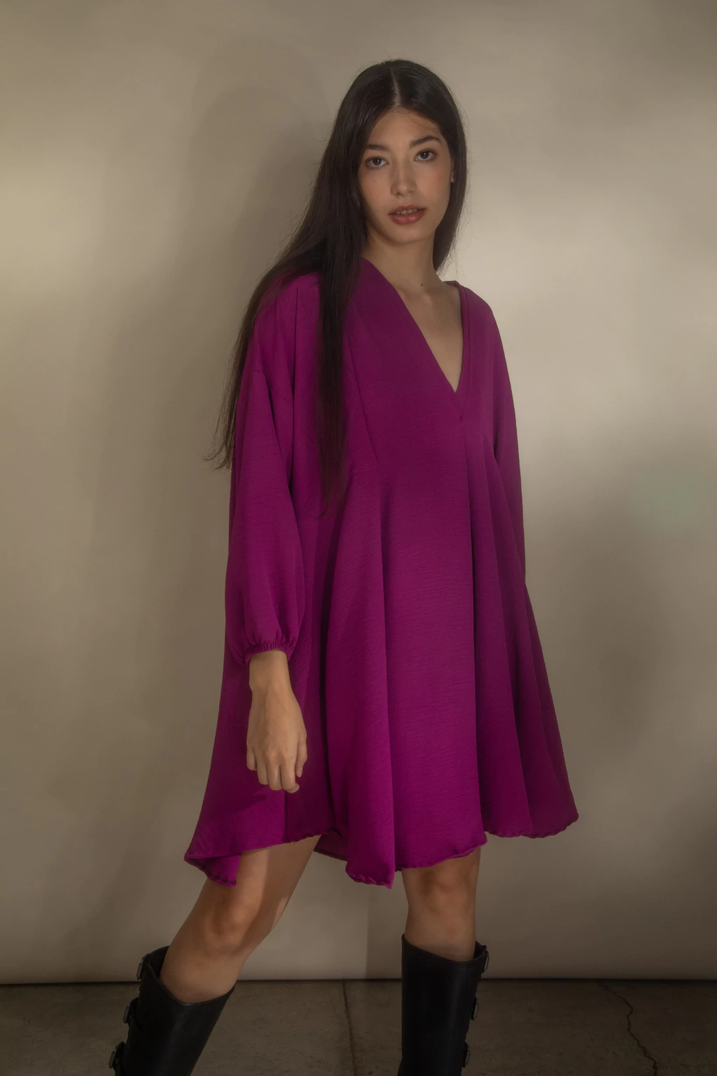 Vestido corto de twill , con frunces en la parte de adelante. Escote en V, manga caída con elástico en el puño, irregular, mas largo detras. El vestido es súper amplio, mirar bien el largo de el T2 porque es largo.