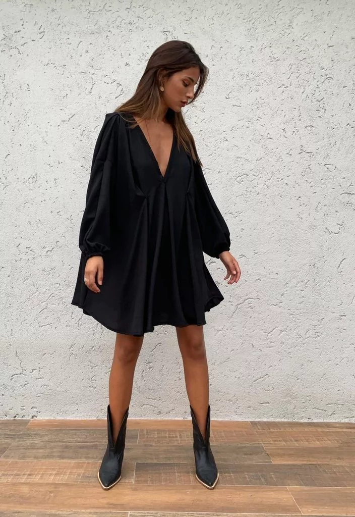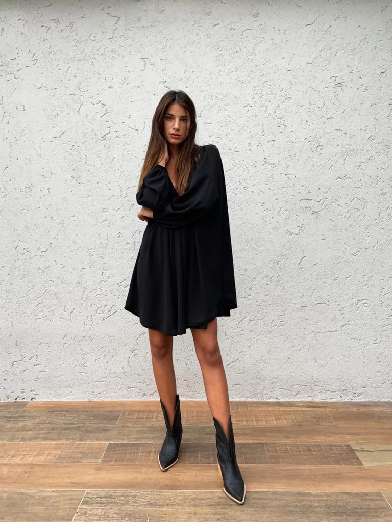 Vestido corto de twill poliester, con frunces en la parte de adelante. Escote en V, manga caída con elástico en el puño, irregular, mas largo detras. El vestido es súper amplio, mirar bien el largo de el T2 porque es largo.