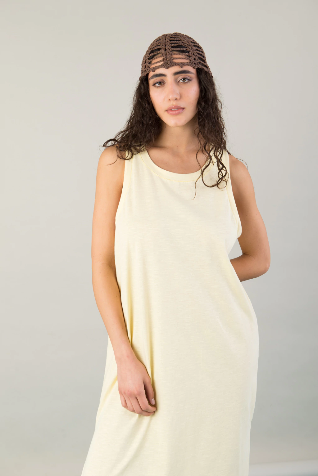 Vestido confeccionado en Algodón, color amarillo suave. Sin mangas, la siza es amplia, escote redondo, tajitos a los costados, es muy cómodo, el vestido ideal para cualquier ocasión que quieras estar comodo y canchero.