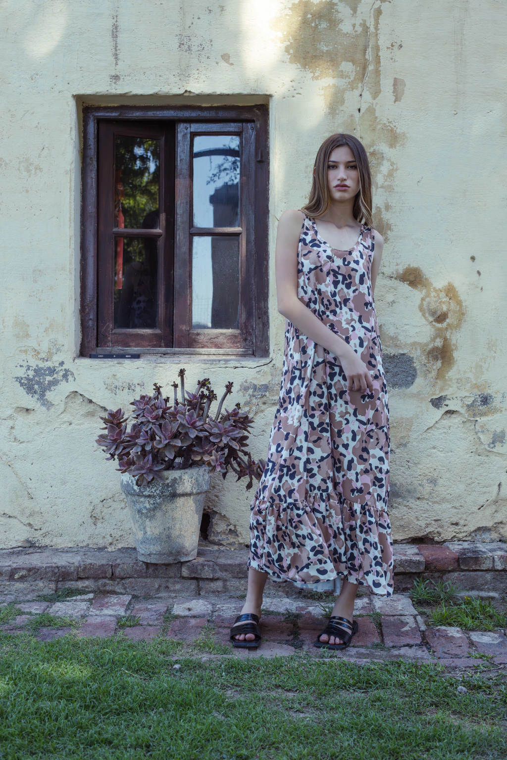 Vestido confeccionado en Tencel de seda, estampa propia de Anna&cherise , largo por arriba de los tobillos escote redondo y volado. Caida amplia y cómoda.
