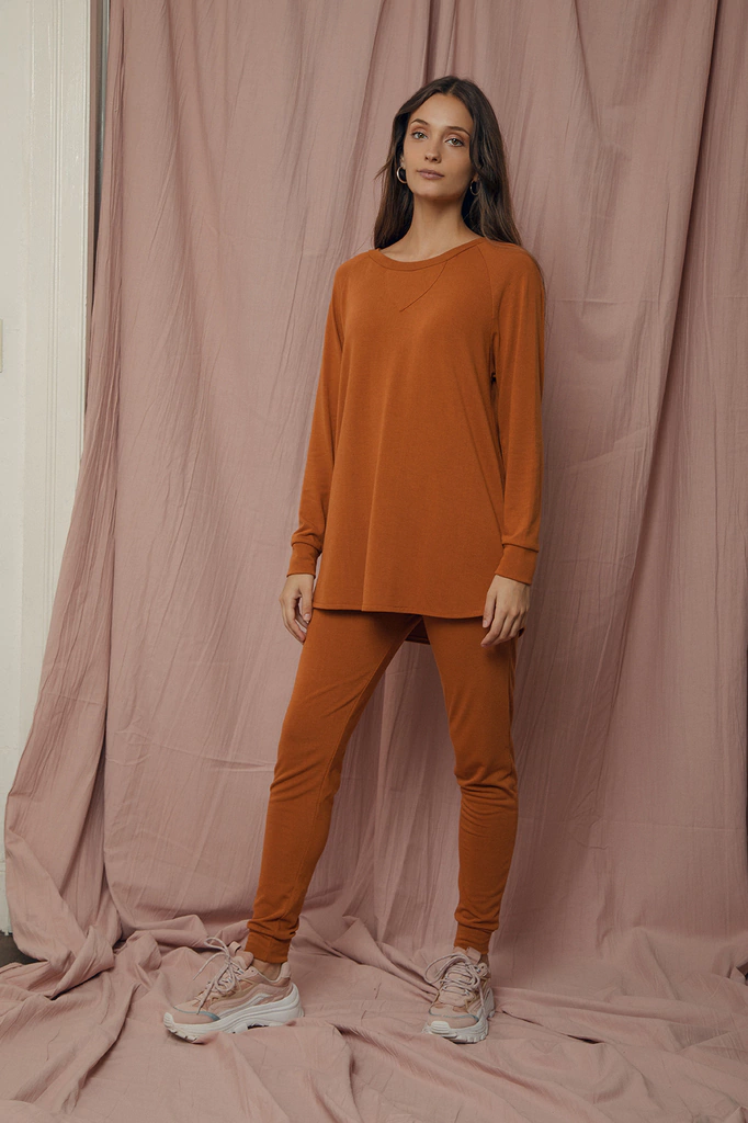 Joggineta de lanilla color terracota con puño, bolsillos delanteros y cintura con elastico.