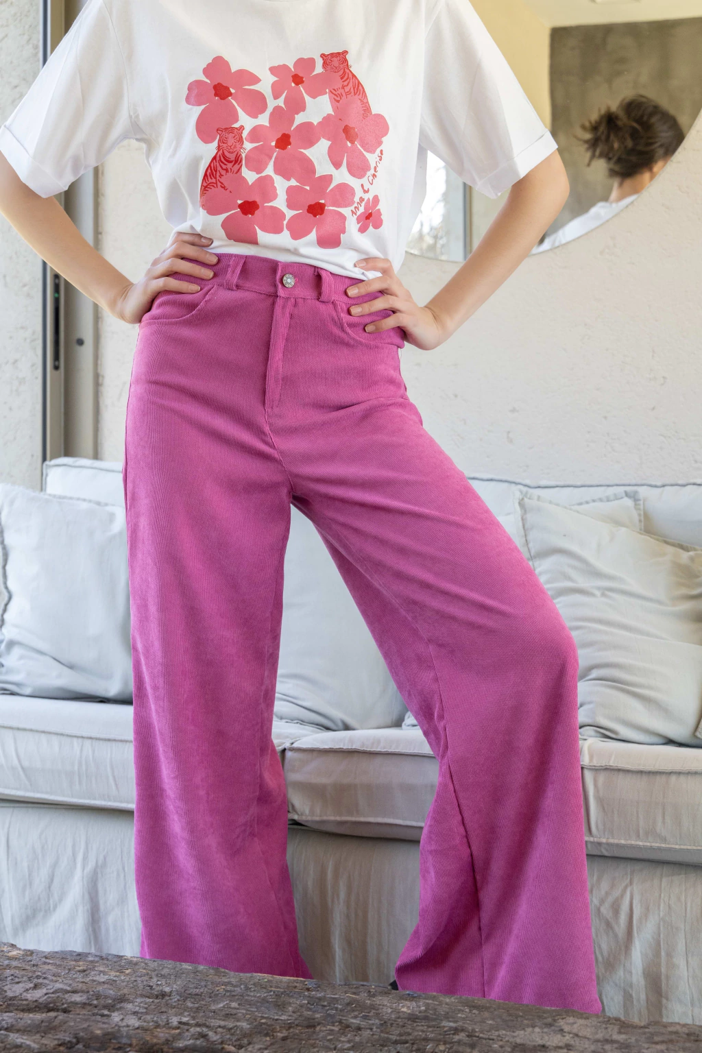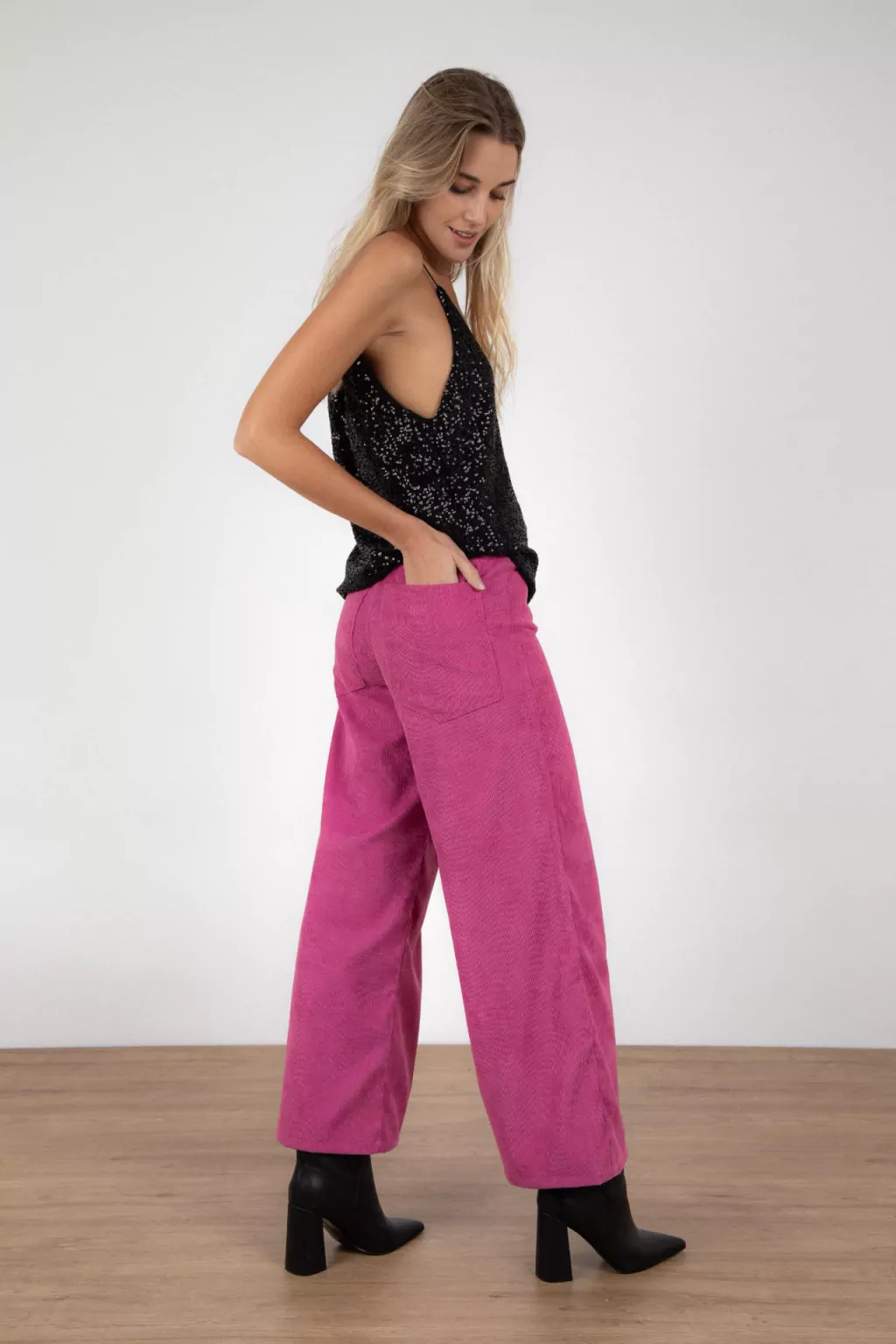 Pantalon Whide Leg Afrodita, de corderoy elastizado fucsia. Cómodisimo y canchero, para looks de día y de noche.