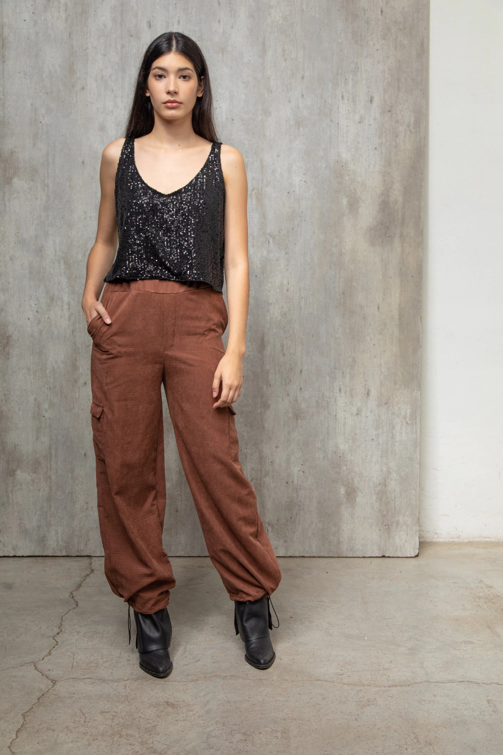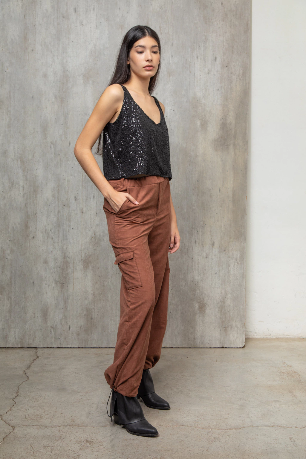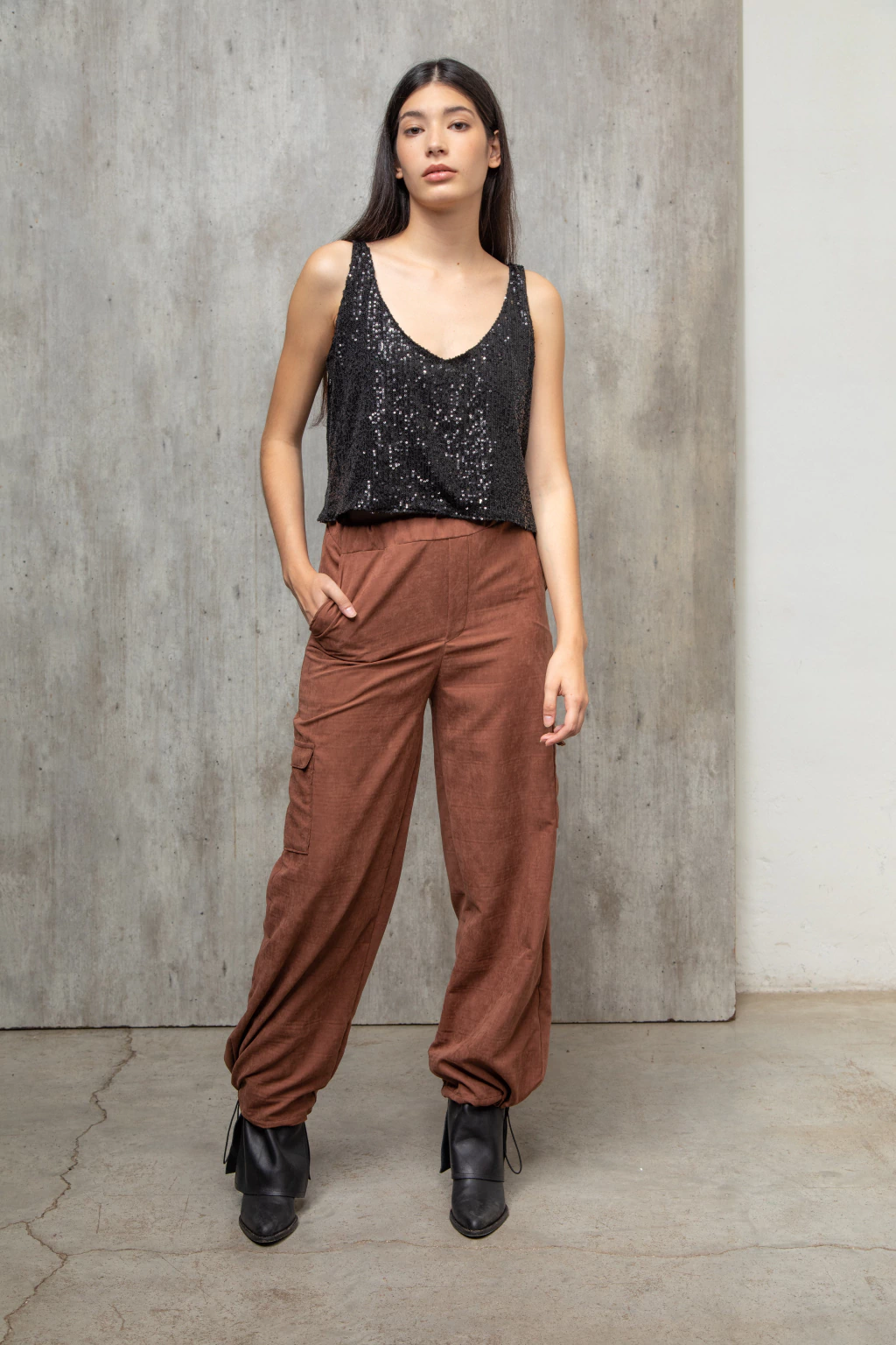 Pantalon cargo confeccionado con sastrero vintage color chocolate, tiene una textura gamuzada con mucho cuerpo. Es un pantalón tipo cargo con bolsillos. Tiene elástico en la cintura y un cierre invisible al costado. En la parte de abajo tiene elástico con presilla lo que permite regular y usarlo como babucha o amplio. Podes llokearlo como quieras, zapas, botas, sandalias, un look más o menos formal. Es cómodo y versatil.