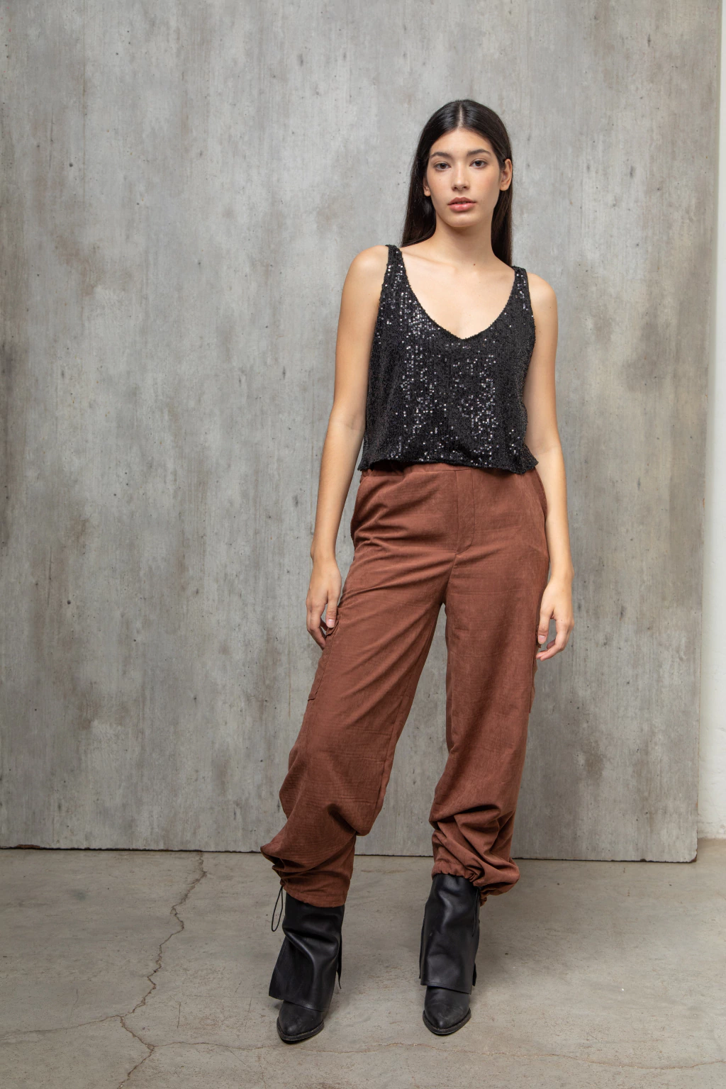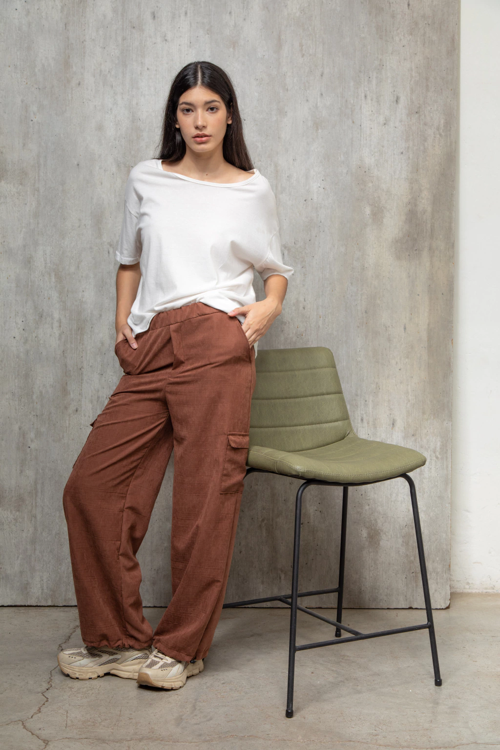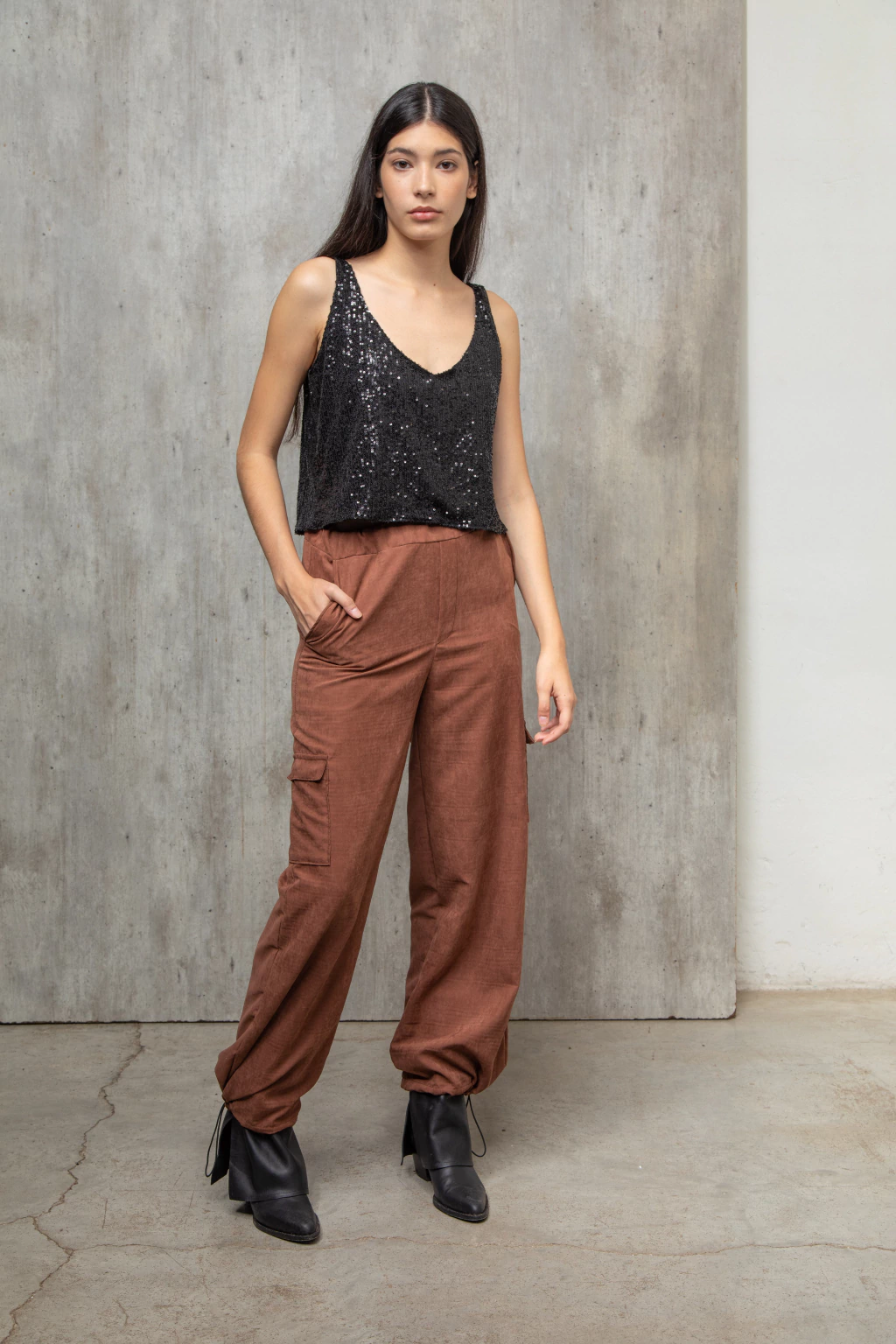 Pantalon cargo confeccionado con sastrero vintage color chocolate, tiene una textura gamuzada con mucho cuerpo. Es un pantalón tipo cargo con bolsillos. Tiene elástico en la cintura y un cierre invisible al costado. En la parte de abajo tiene elástico con presilla lo que permite regular y usarlo como babucha o amplio. Podes llokearlo como quieras, zapas, botas, sandalias, un look más o menos formal. Es cómodo y versatil.