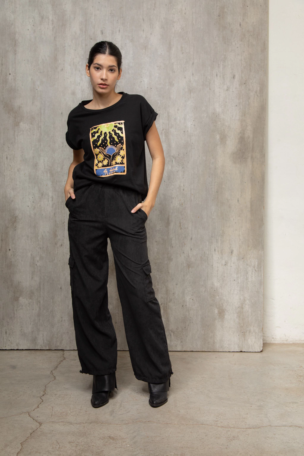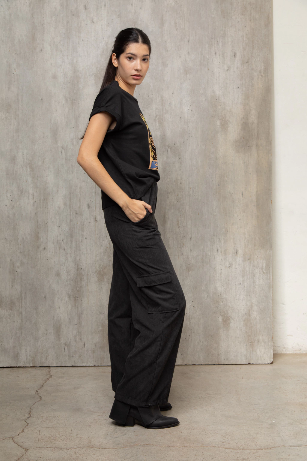 Pantalón cargo confeccionado con sastrero vintage color chocolate, tiene una textura gamuzada con mucho cuerpo. Es un pantalón tipo cargo con bolsillos. Tiene elástico en la cintura y un cierre invisible al costado. En la parte de abajo tiene elástico con presilla lo que permite regular y usarlo como babucha o amplio. Podes llokearlo como quieras, zapas, botas, sandalias, un look más o menos formal. Es cómodo, canchero y versatil.