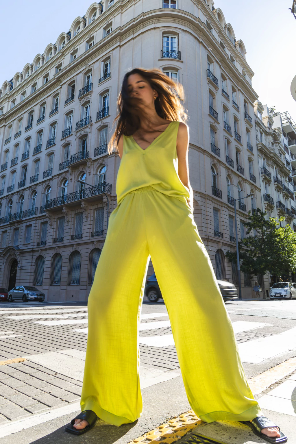 Pantalón tipo palazzo, confeccionado con lino elastizado color lima. Tiene elástico en cintura y bolsillos delanteros. Súper cómodo, fresco e ideal para combinar con nuestra blusa materia color lima. ¡'Armá tu set Anna!