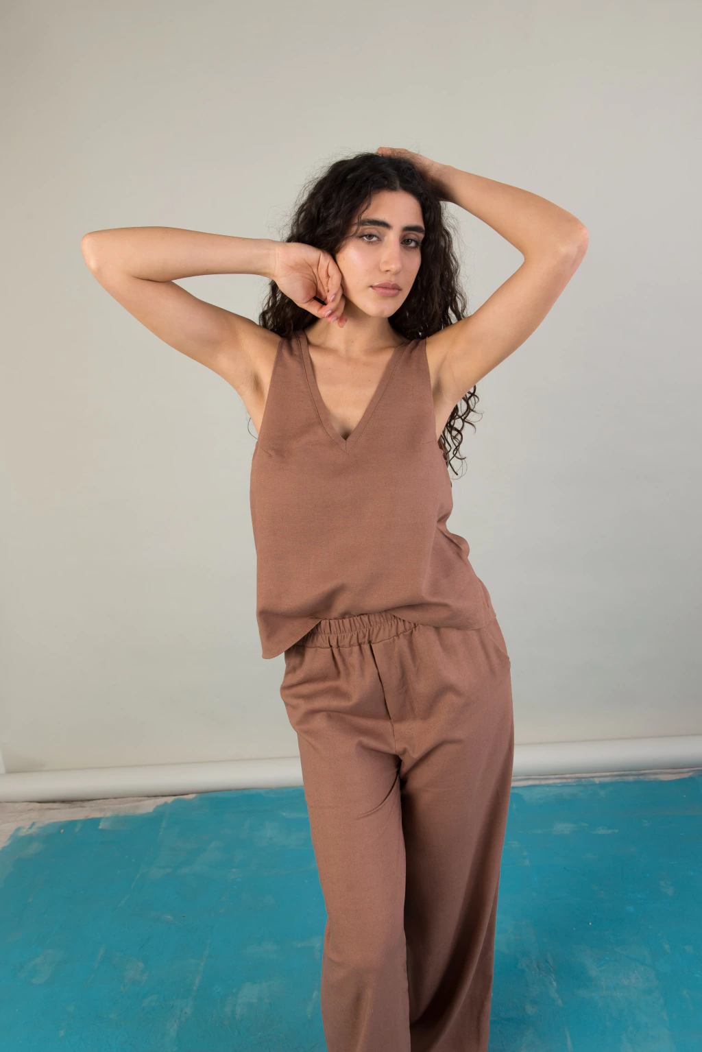 Set compuesto por Blusa + Pantalón tipo palazzo, confeccionado en lino color chocolate