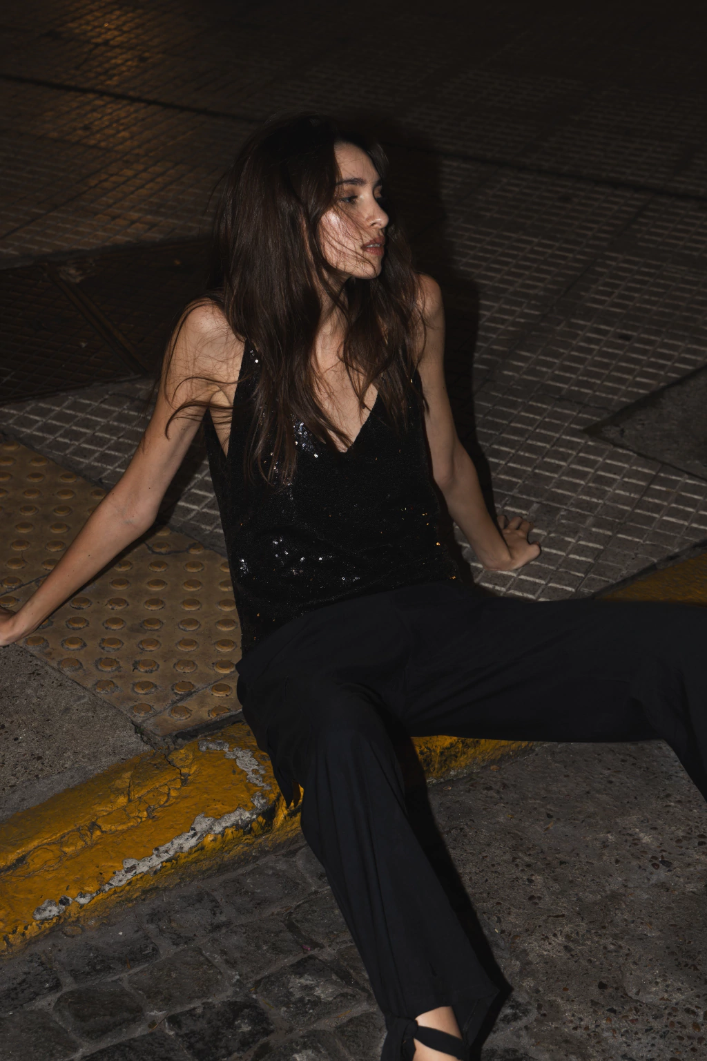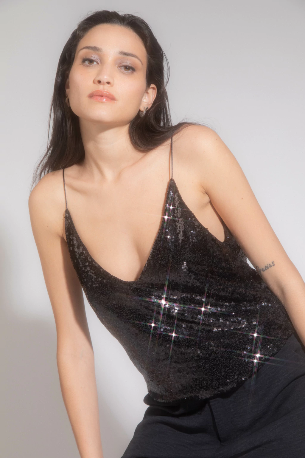 Top de lentejuela elastizada con forro de muselina negra. Tiene tiras de cola cordón de seda. Una prenda ideal para levantar un look.