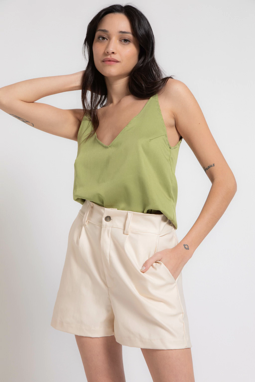 Top Minerva twill verde cítrico. Un básico para completar tus looks de día y de noche. Podes completar tu look con nuestro short Cronos offwhite.
