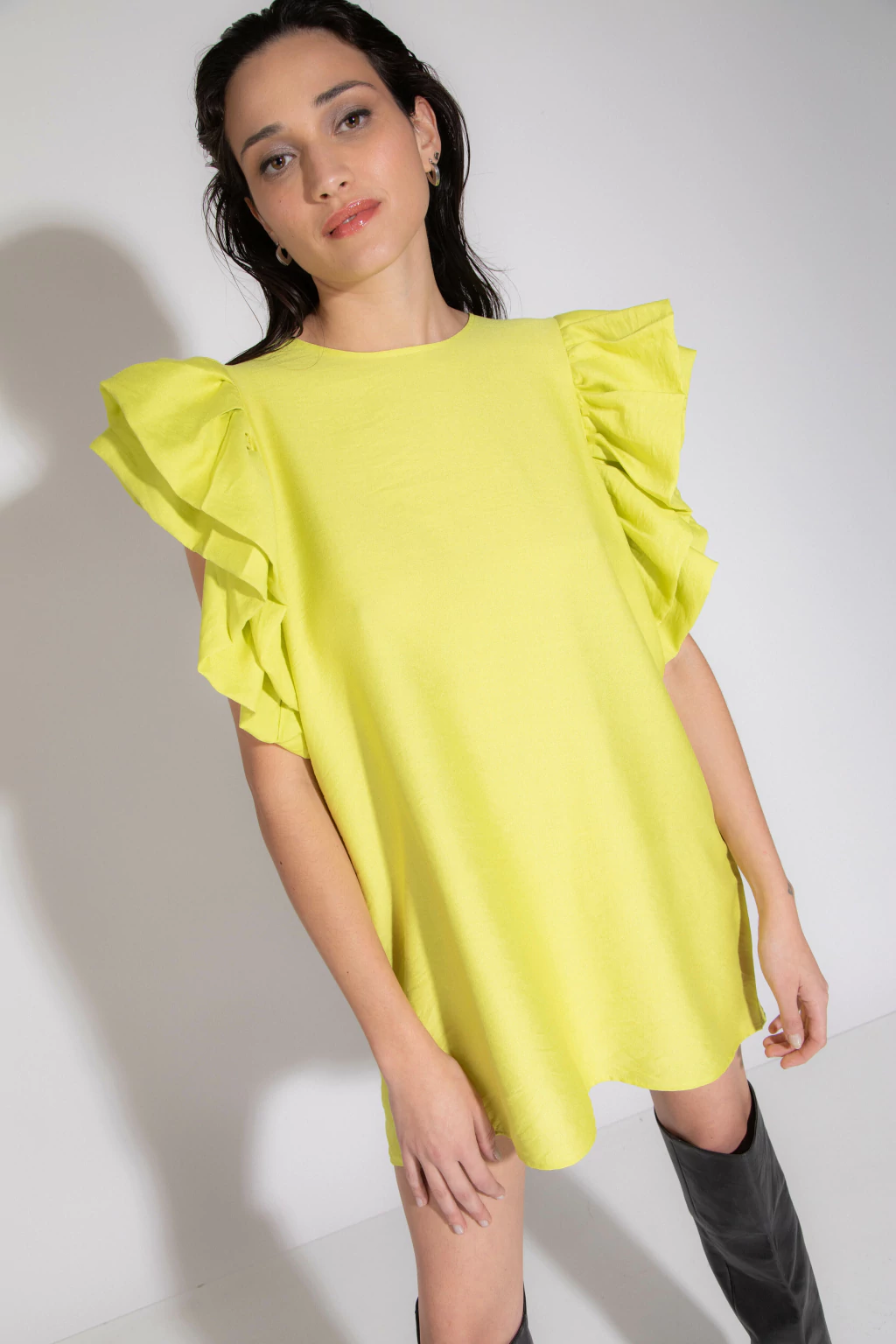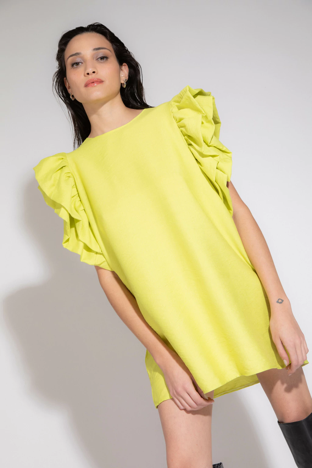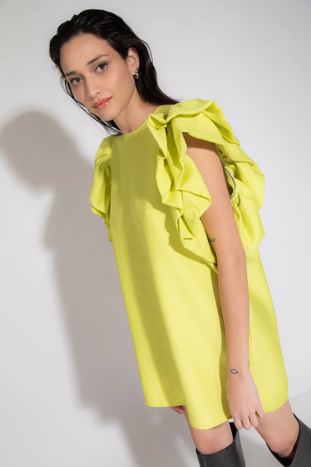Vestido confeccionado en creppe de seda color lima, con doble volado en la manga. Puede usarse con o sin lazo. Es cómodo y tiene linda caída. Un shock de color.
